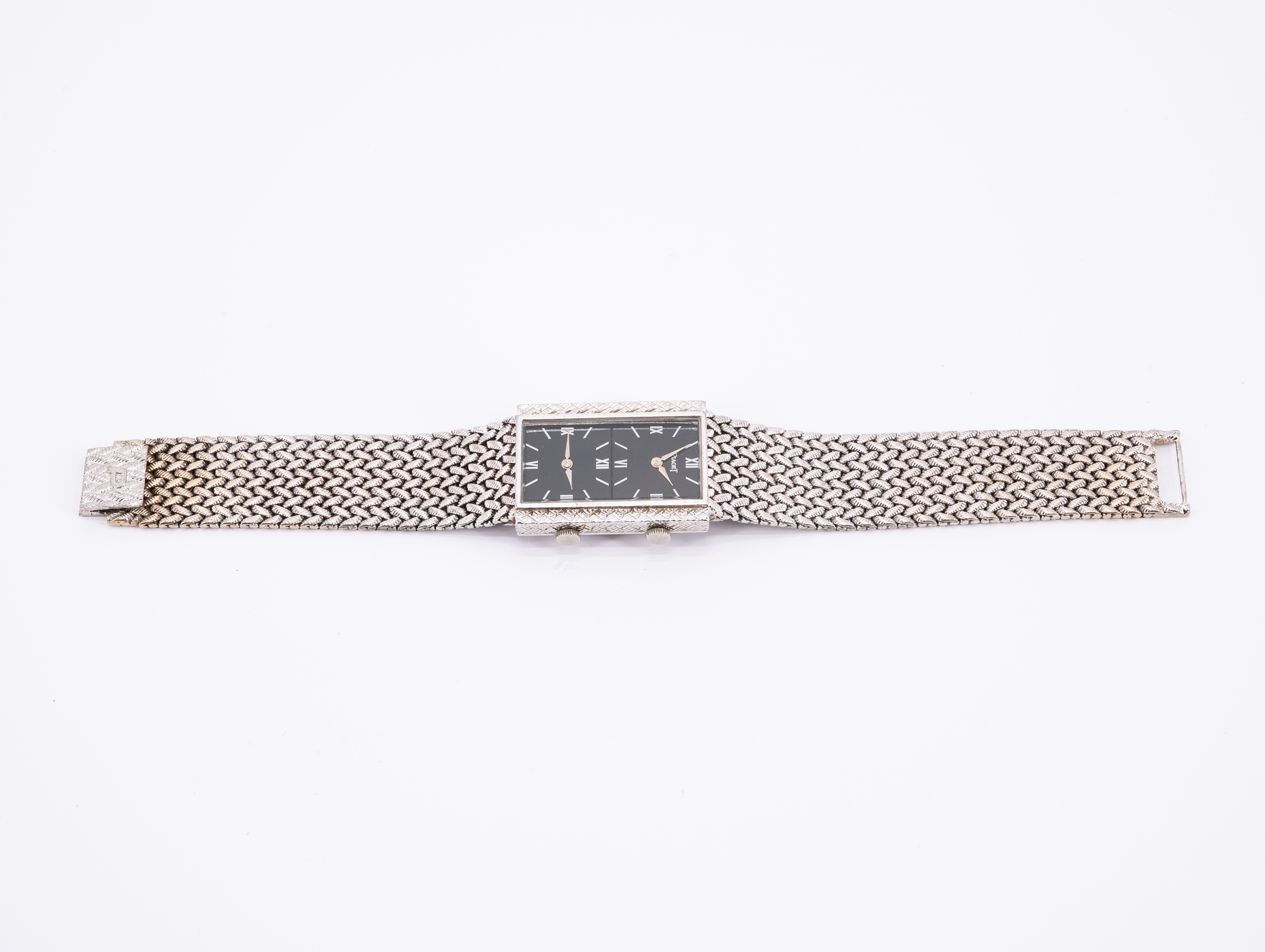 Gehäuse/Armband: 750/- Weißgold, Milanaisearmband, Zffbl. schwarz, Zeiger silbern, römische Ziffern weiß.