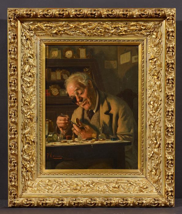 Der alte Uhrmacher bei der Arbeit. Signiert unten links: P. Massani Firenze. Öl auf Holz. 40,5 x 30cm. Rahmen.