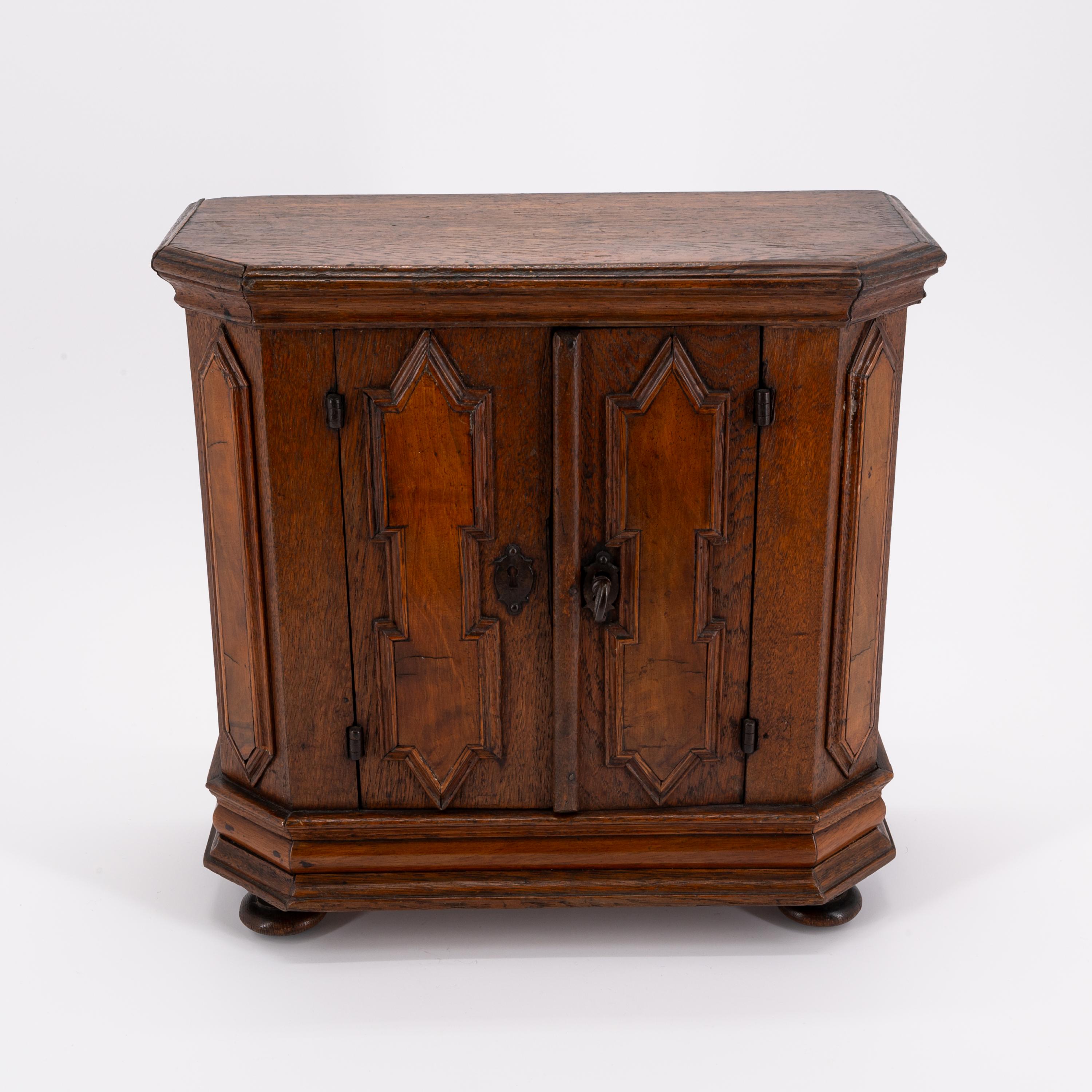 Beschreibung: Der kleine zweitürige Barockschrank mit sog. Bastionsfüllungen auf Ballenfüßen war eine