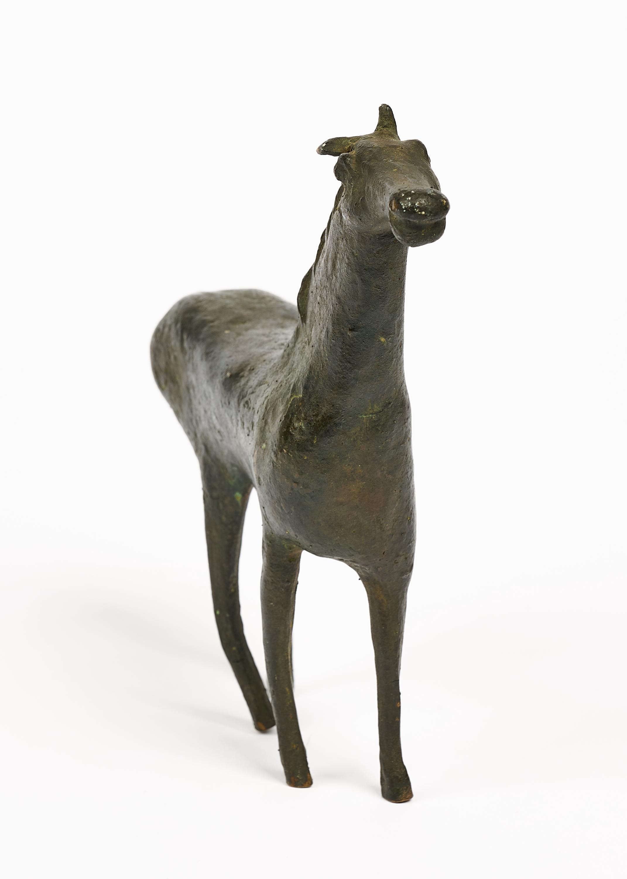 Leichte Bereibungen an der Nase, an den Ohren, an der Kruppe rechts und dem Schweifansatz. Minimale weißliche Rückständen in den Vertiefungen (von Gips?), teilweise minimal grünlich. Leichte Bereibungen an der rechten Flanke an zwei Stellen. Patina minimal fleckig an der linken Flanke. Ansonsten guter Zustand.