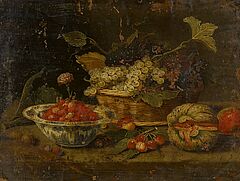 Titel: Stillleben mit einem Korb Weintrauben, einer Porzellanschüssel mit Erdbeeren und einer Melone.