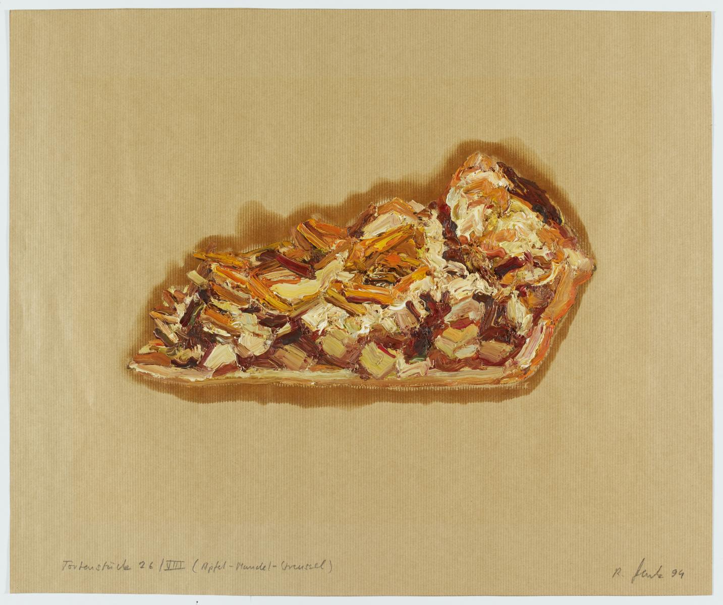 Bezeichnung: Signiert und datiert unten rechts: R. Fleck 94. Betitelt unten links: Tortenstück 26/VIII (Apfel-Mandel-Streusel).