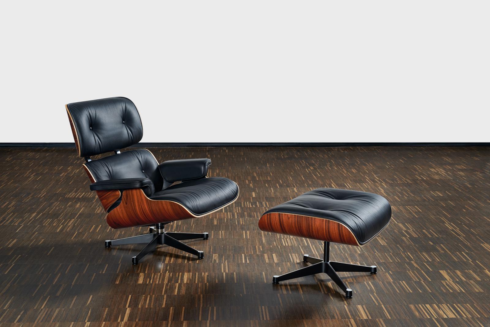 Lounge Chair und Ottomane. 1956 (Entwurf). Santos Palisander und schwarzes Leder auf Aluminiumfuß, partiell poliert und schwarz pulverbeschichtet. Lounge Chair: Ca. 88,5 x 84 x 90cm. Ottomane: Ca. 42,5 x 65,5 x 52cm. Jeweils bezeichnet auf einem Etikett des Herstellers auf der Unterseite: Original Eames Lounge Chair. Vitra (Hersteller).