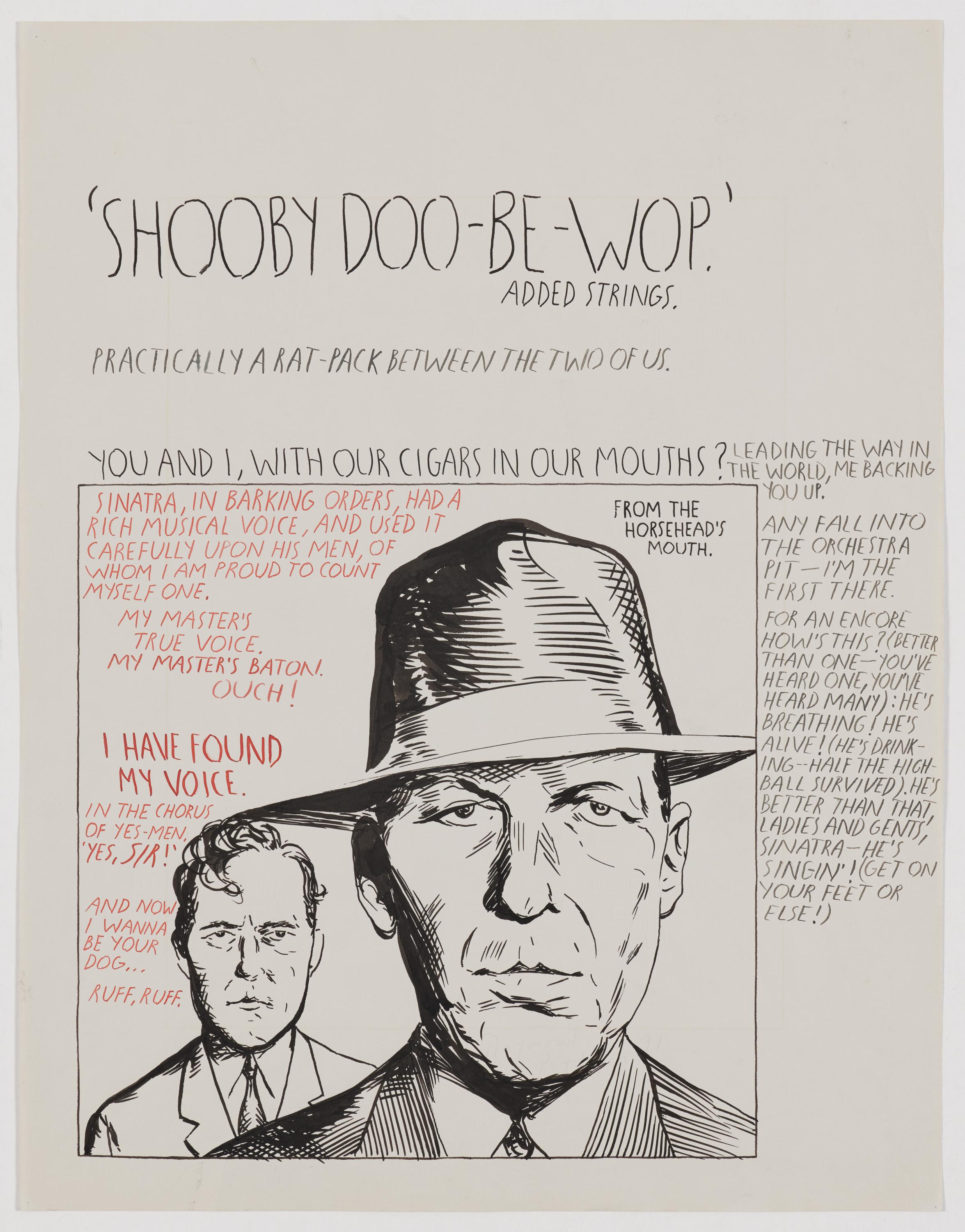 Bezeichnung: Betitelt oben: 'SHOOBY DOO-BE-WOP.' Signiert und datiert unten rechts (verblasst): Raymond Pettibon 91. Nochmals signiert und datiert verso mittig: Raymond Pettibon 91.