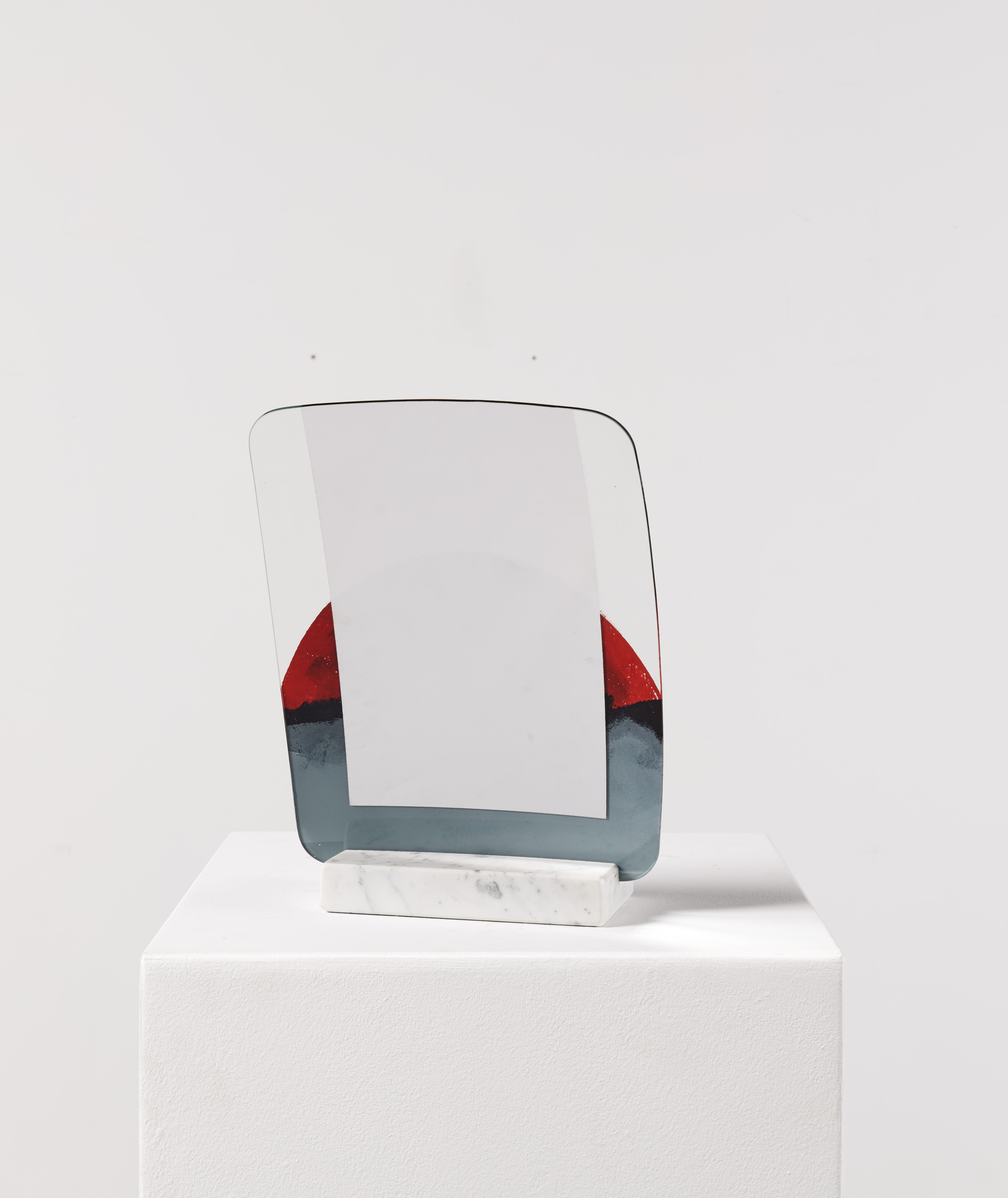 Technik: Gebogenes Glas, recto emailliert, verso verchromt. Auf Granitsockel. In der originalen Verpackung.