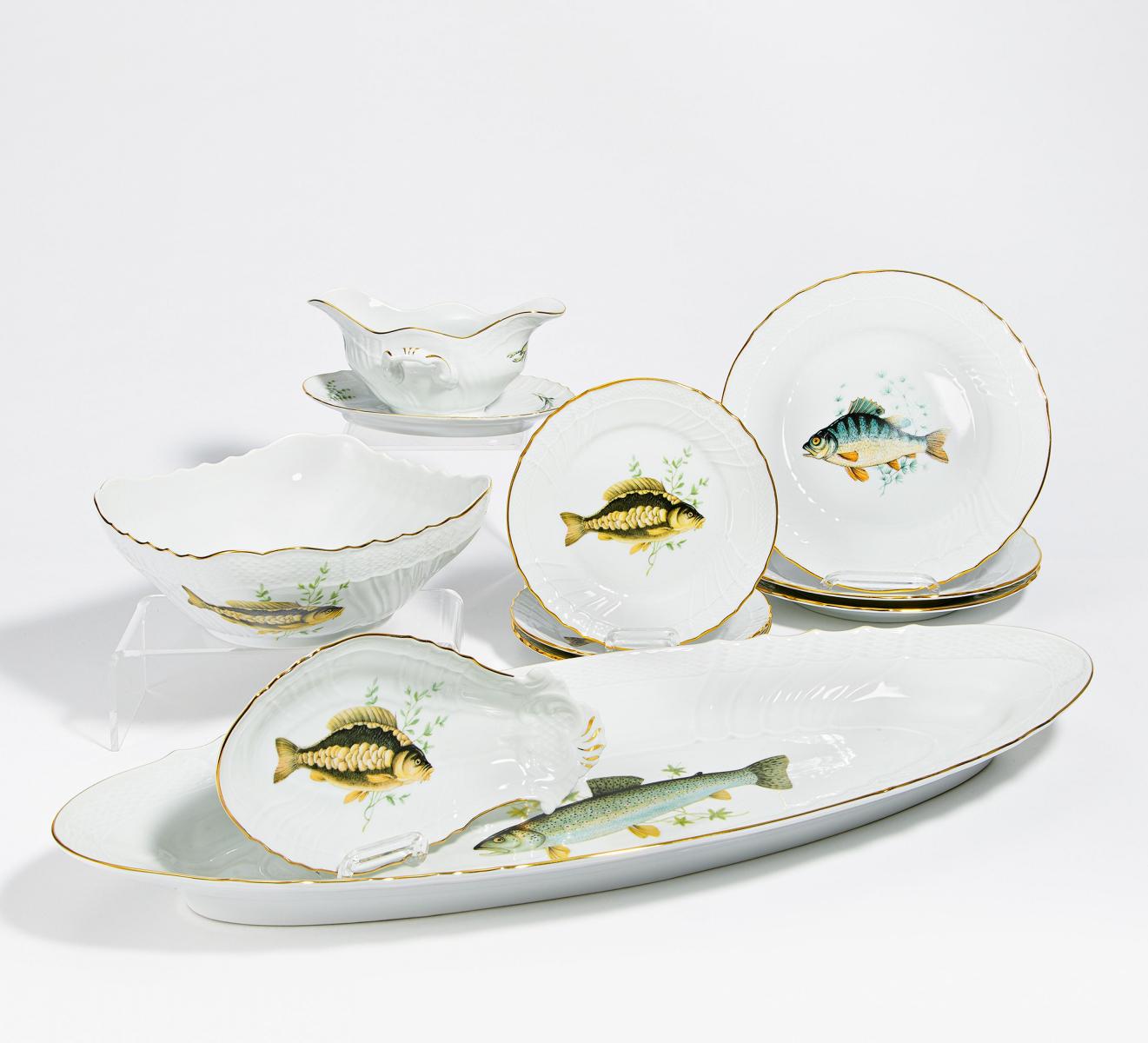Beschreibung: 25 Teile bestehend aus: 10 Speisetellern, 10 Vorspeisentellern, 1 Fischplatte, 1 Sauciere,