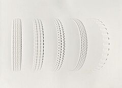 Five tyres remoulded. 1971. Kassette mit 1 Kunststoff-Relief (Elastomer), 7 Serigraphien auf Klarsichtfolien und 1