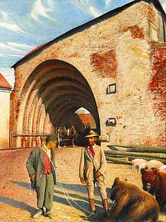 " Vor großem ... Eingangstor...." (unleserlich). 1945. Öl auf Holz. 44,5 x 35,5cm. Signiert und datiert unten links: Rich. Müller 1945. Rückseitig nochmals signiert und datiert und unleserlich betitelt. Rahmen.