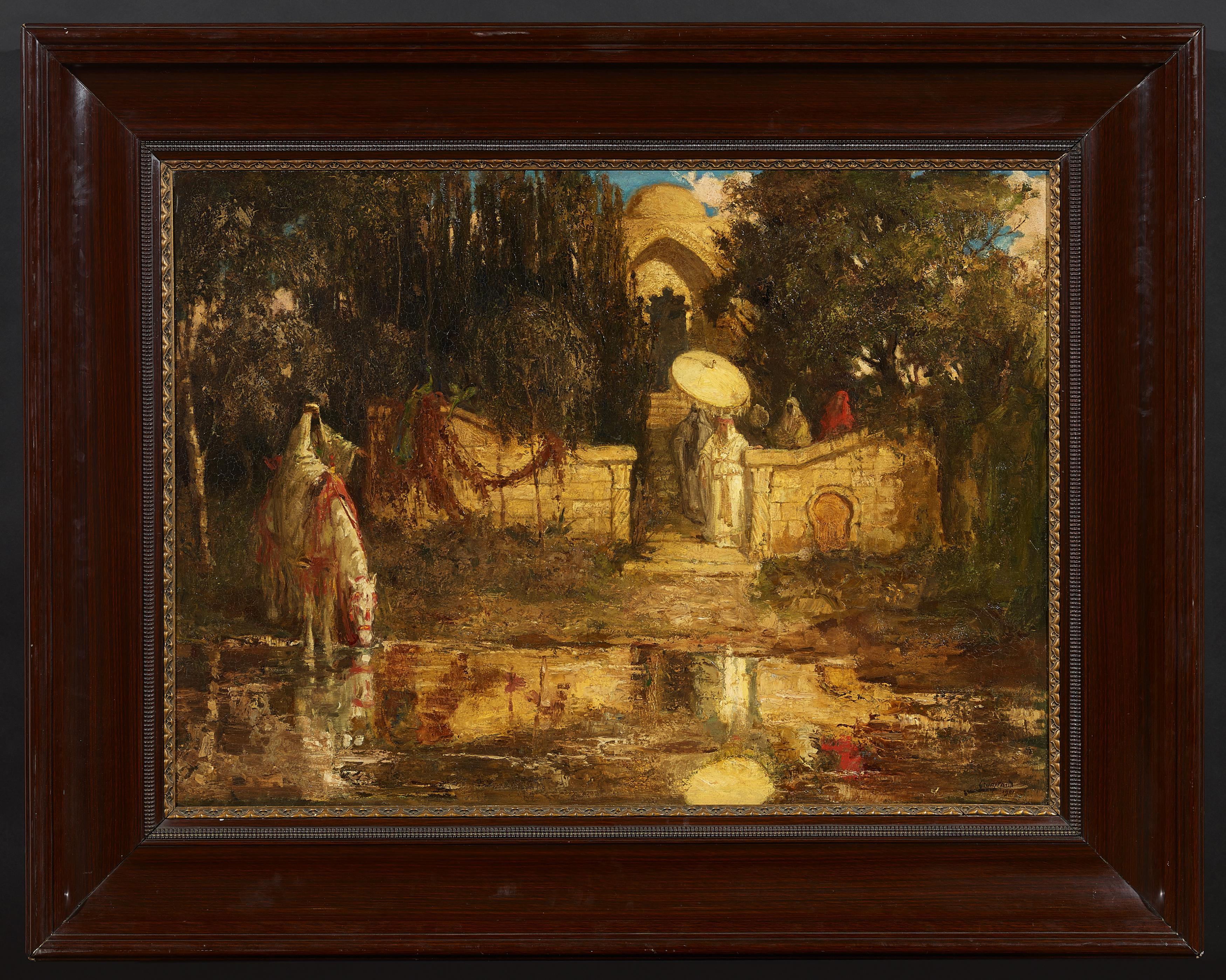 Ca. 1900 ließ sich der Künstler in seinem Atelier vor der Staffelei fotografieren. Auf dem Foto ist das hier gezeigte Gemälde als fertiges Bild im Hintergrund zu sehen.