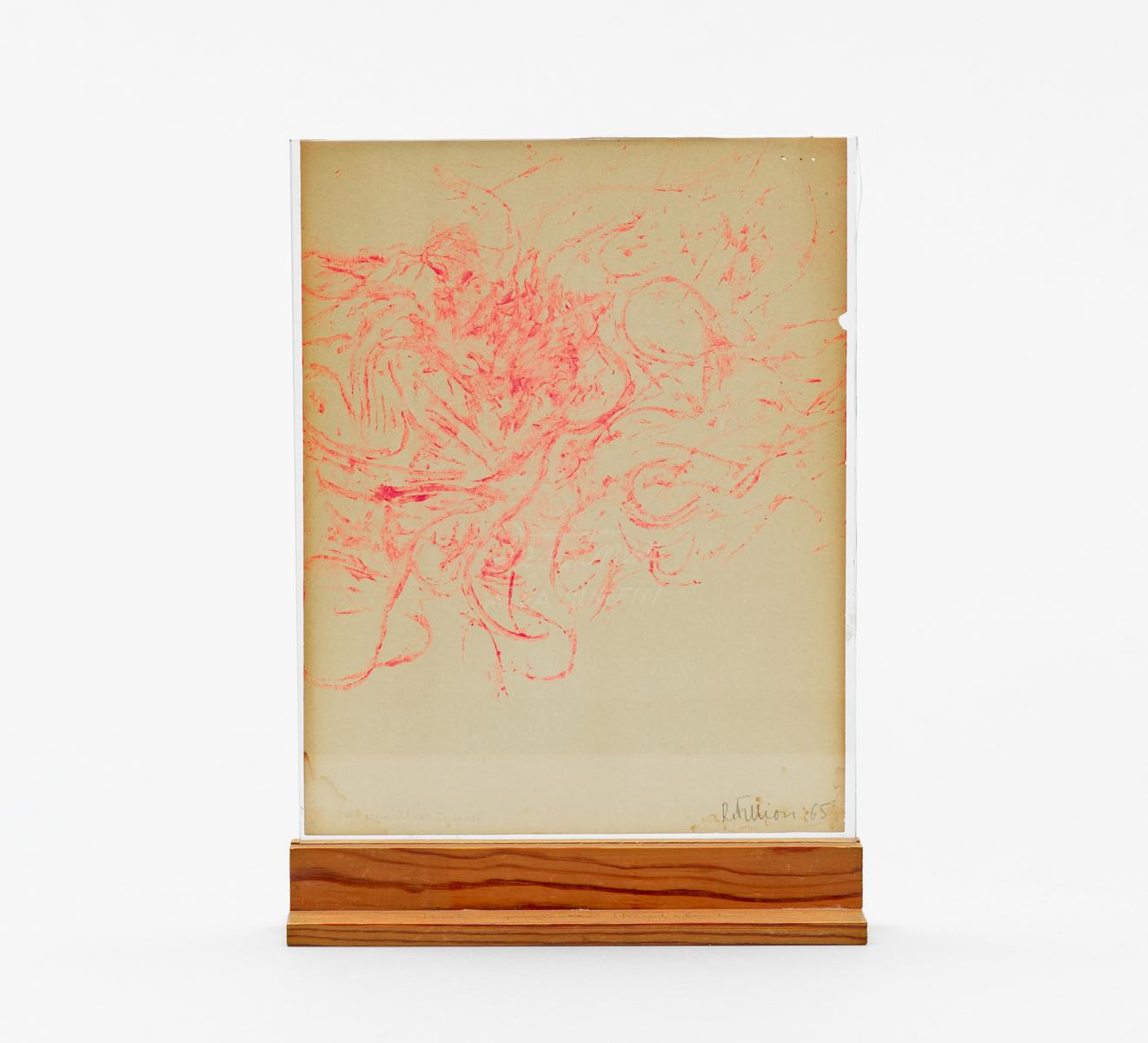 "Pink Spaghetti-Handshake". 1965. Objekt. Pastellzeichnung beidseitig auf Papier zwischen zwei Glasscheiben. In hölzernem