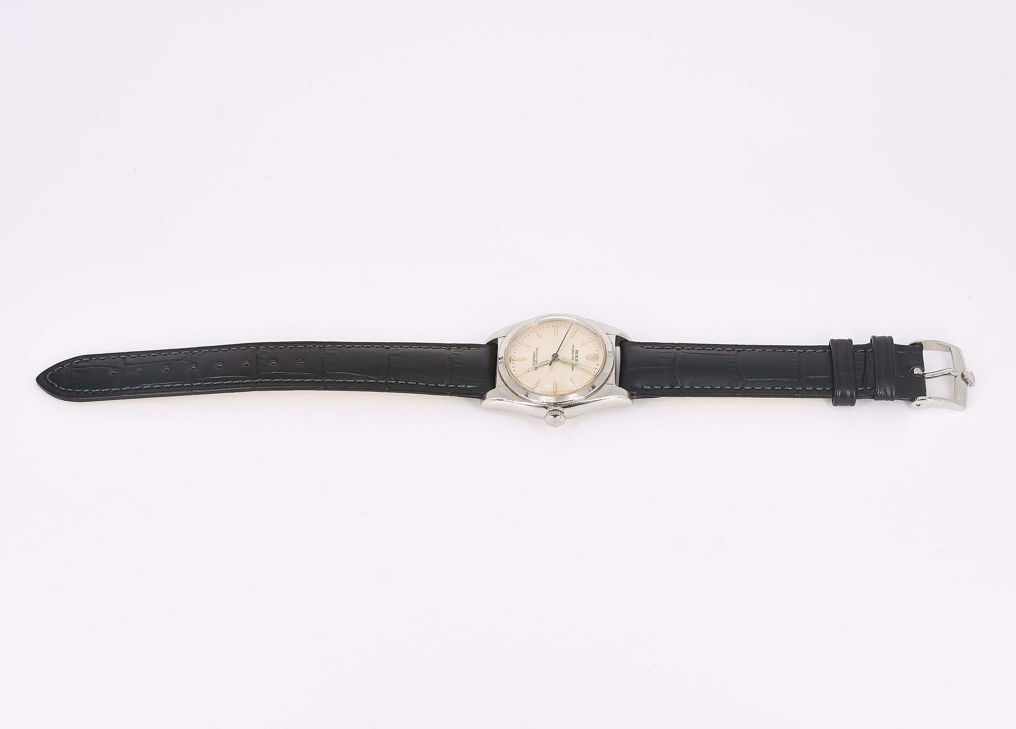 Gehäuse/Armband: Stahl, Lederarmband mit orig. Dornschließe, Zffbl. elefenbeinfarben, Zeiger silbern und gebläut, Indizes silbern.