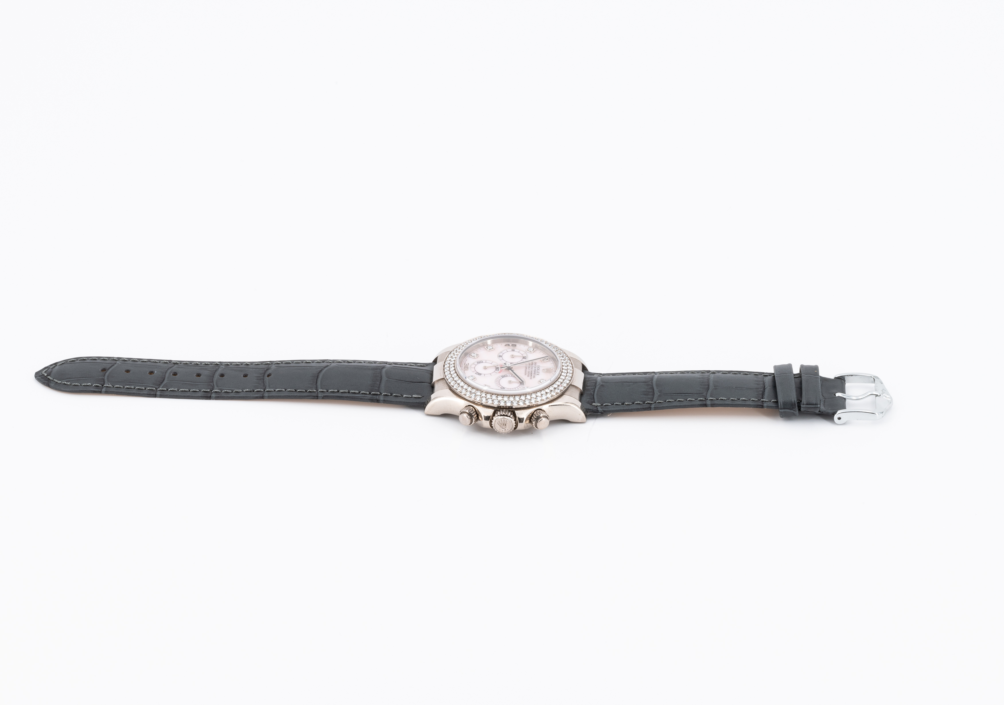 Gehäuse/Armband: 750/- Weißgold, Lünette mit orig. Brillantbesatz, 124 Brillanten zus. ca. 2,1 ct., Lederband mit Dornschließe, Perlmutt-Zffbl., Zeiger schwarz-silbern, 8 Diamant-Indizes im Achtkant-Schliff.