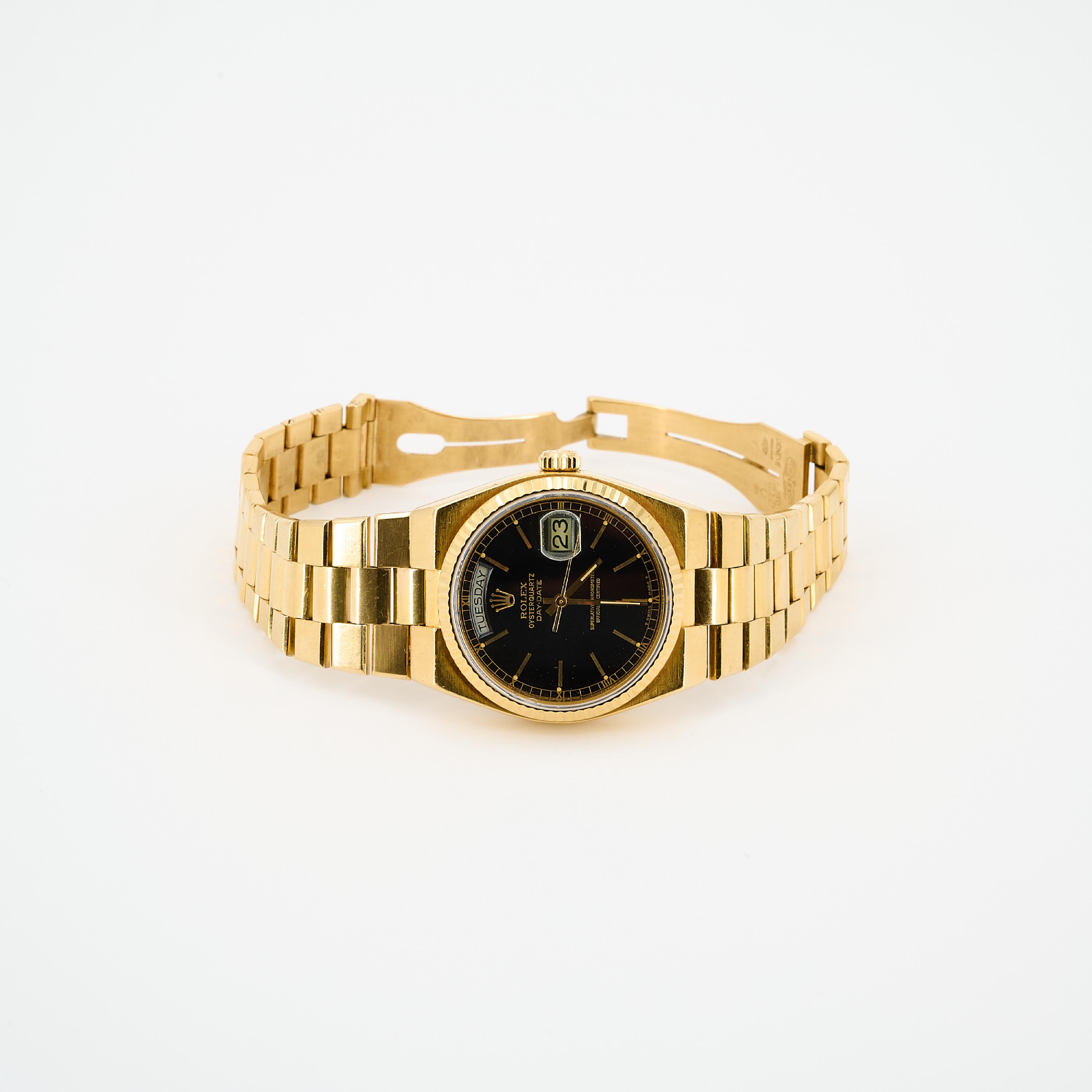 Gehäuse/Armband: 750/- Gelbgold, Oyster-Quartz-Armband mit Crownclasp, Zffbl. schwarz, Zeiger und Indizes golden, Leuchtmasse.