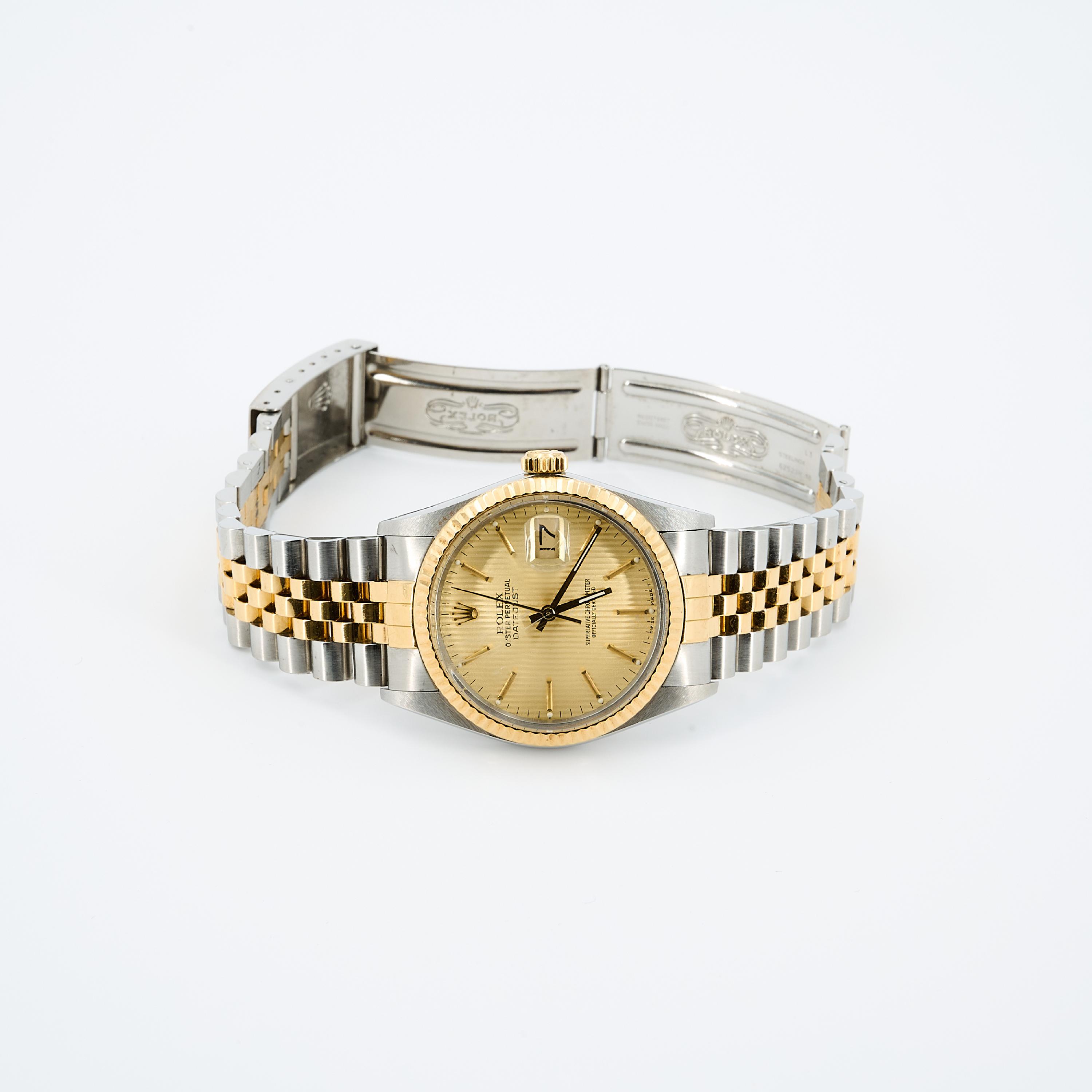 Gehäuse/Armband: Stahl, 750/-Gelbgold, Jubilee-Band mit Faltschließe, Zffbl. golden, Zeiger und Indizes golden, Leuchtmasse.