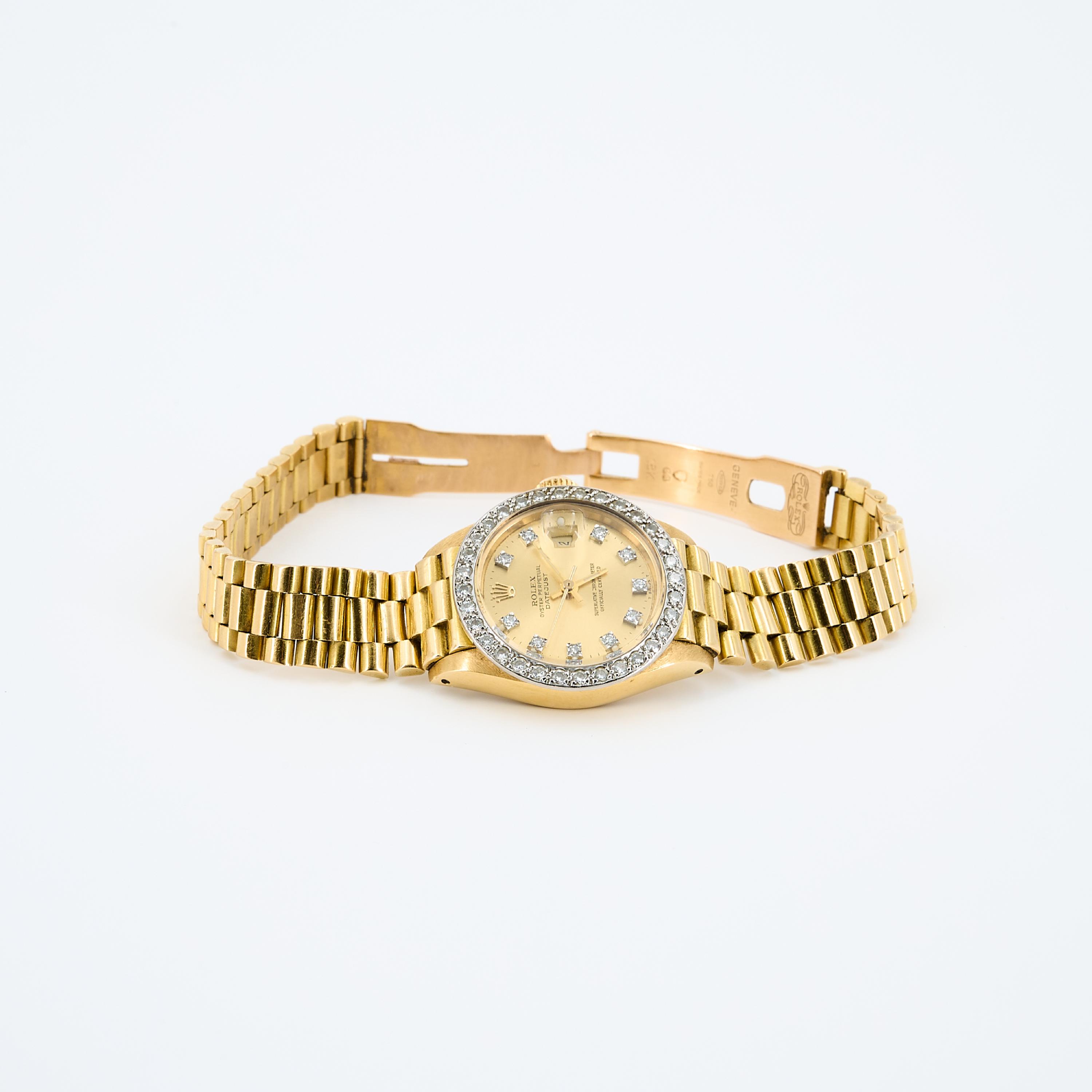 Gehäuse/Armband: 750/- Gelbgold mit Brillantbesatz, 32 Brillanten zus. ca. 0,32 ct., Zffbl. und Zeiger golden, Brillant Indizes, Leuchtmasse.