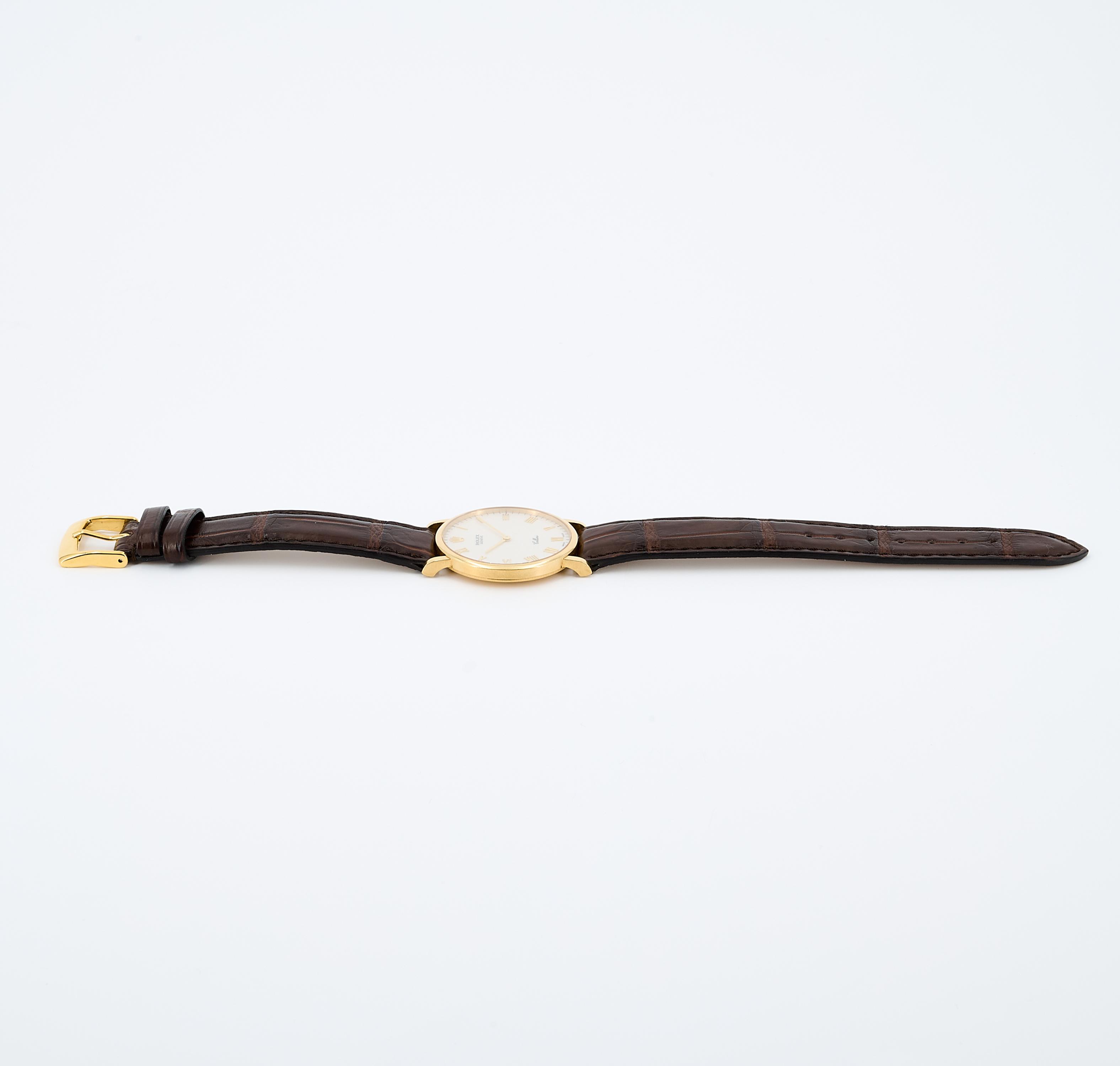 Gehäuse/Armband: 750/- Gelbgold, Lederarmband mit Dornschließe, Zffbl. weiß, Zeiger und römische Ziffern golden.