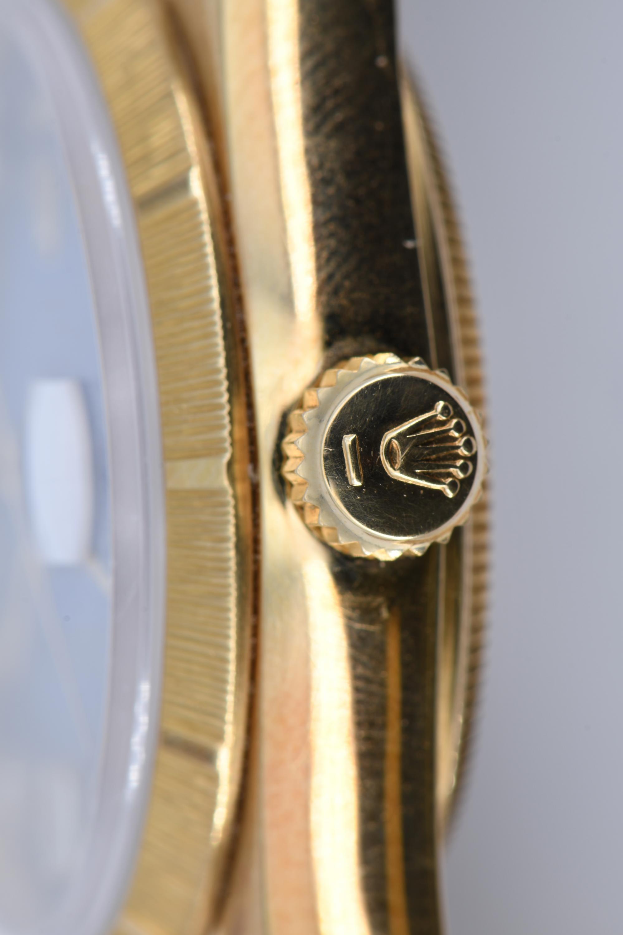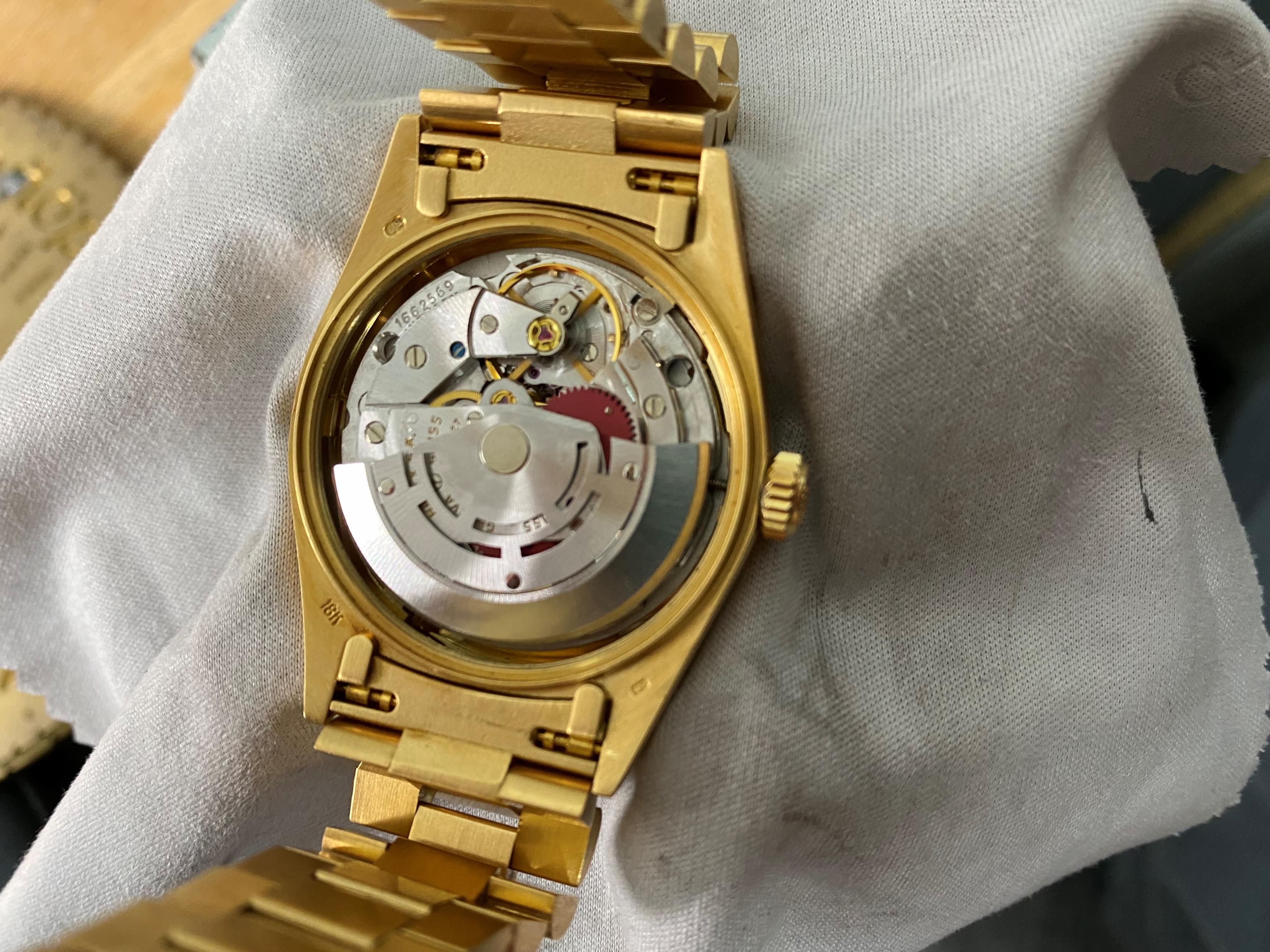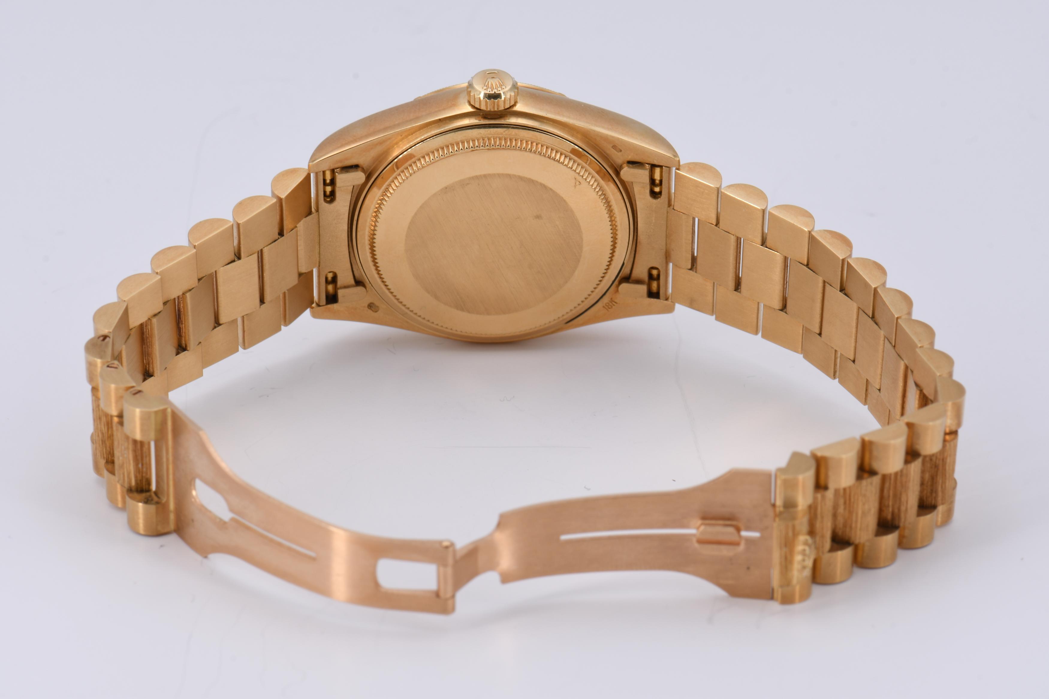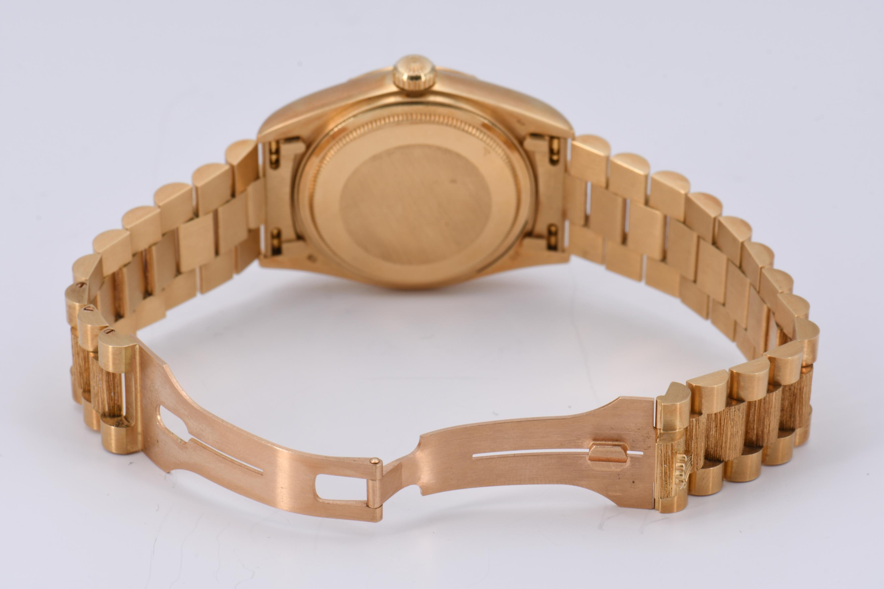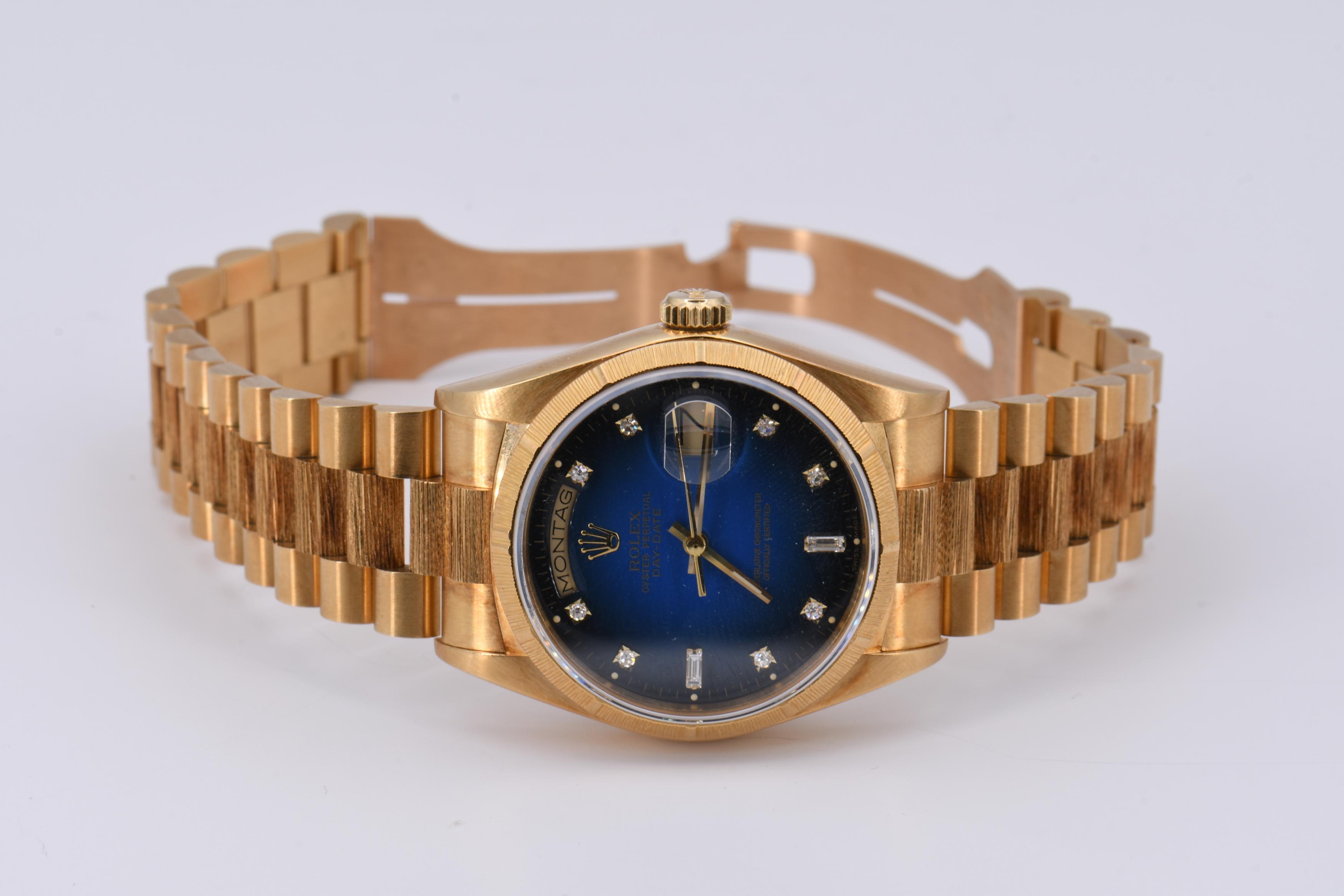 Gehäuse/Armband: 750/- Gelbgold, President-Armband mit Crownclasp-Schließe, Zffbl. dunkel-hellblau verlaufend, Indizes diamantgeziert, Zeiger golden/fluoreszierend.