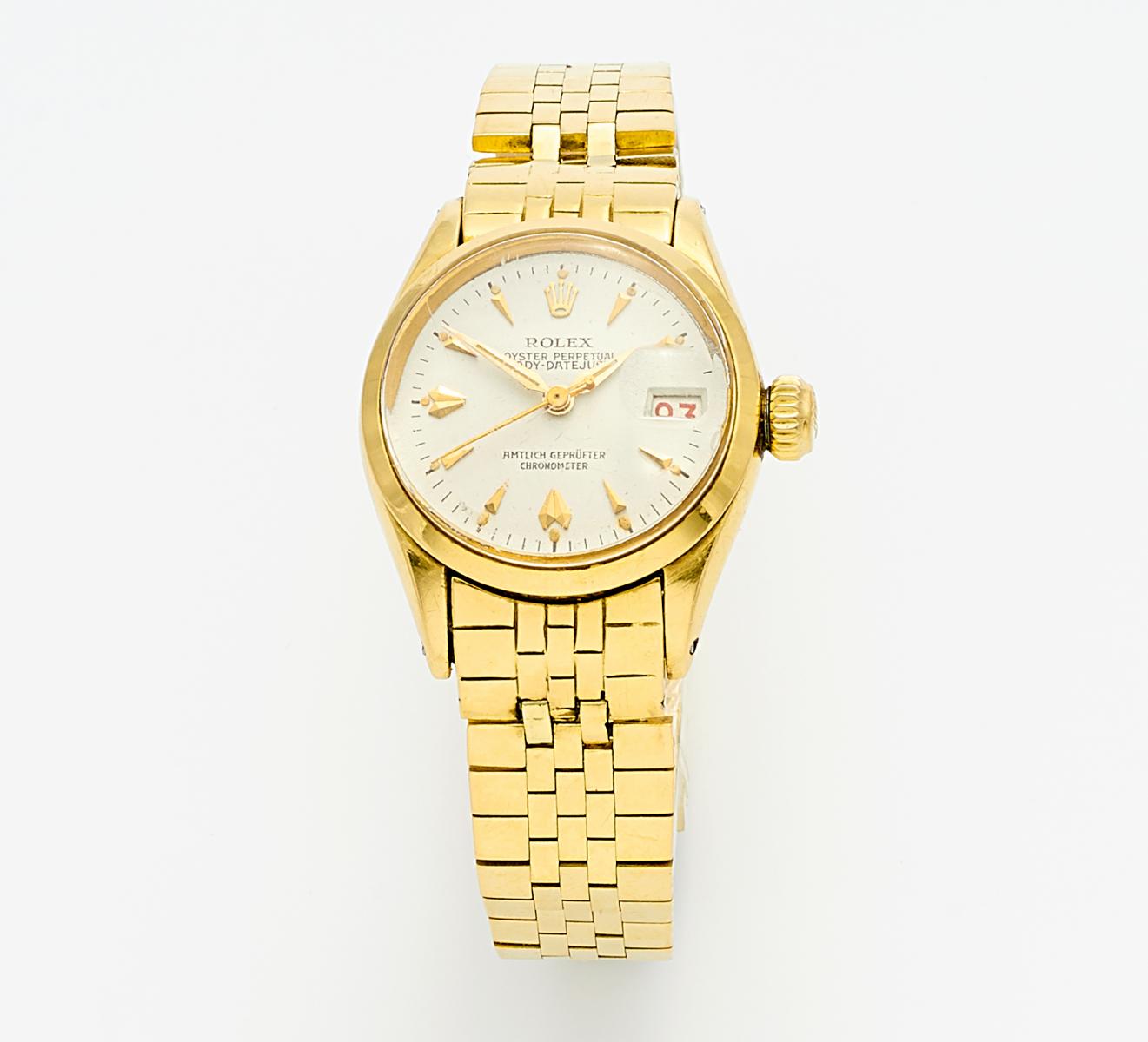 Gehäuse/Armband: 750/- Gelbgold, gestempelt, Zffbl. lackiert, bedruckt, Zeiger/Indizes golden, Datumsanzeige.