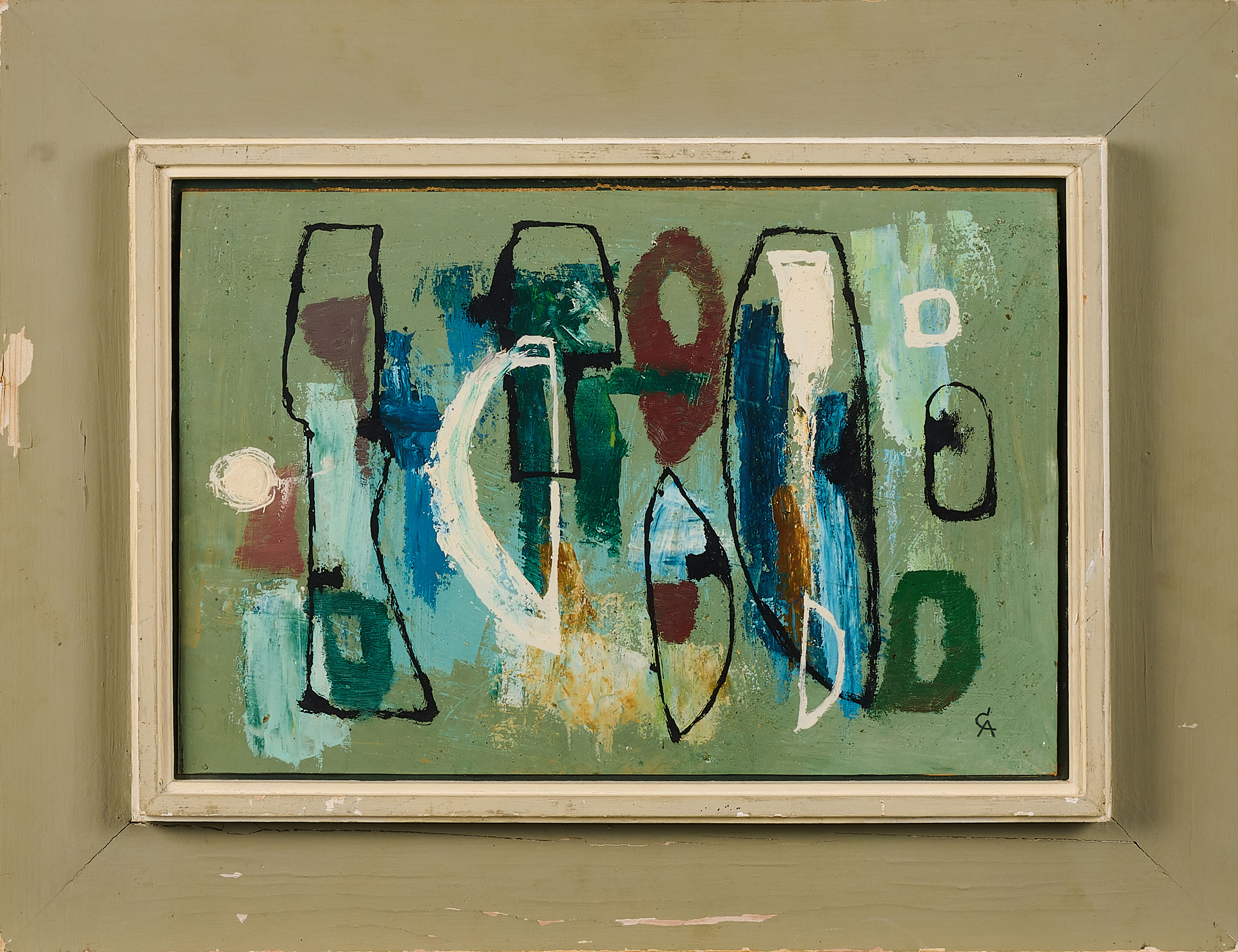 Bezeichnung: Monogrammiert unten rechts: CA (Künstlersignet). Sowie signiert und datiert verso: rolf cavael 1954. Hier zudem gewidmet.
