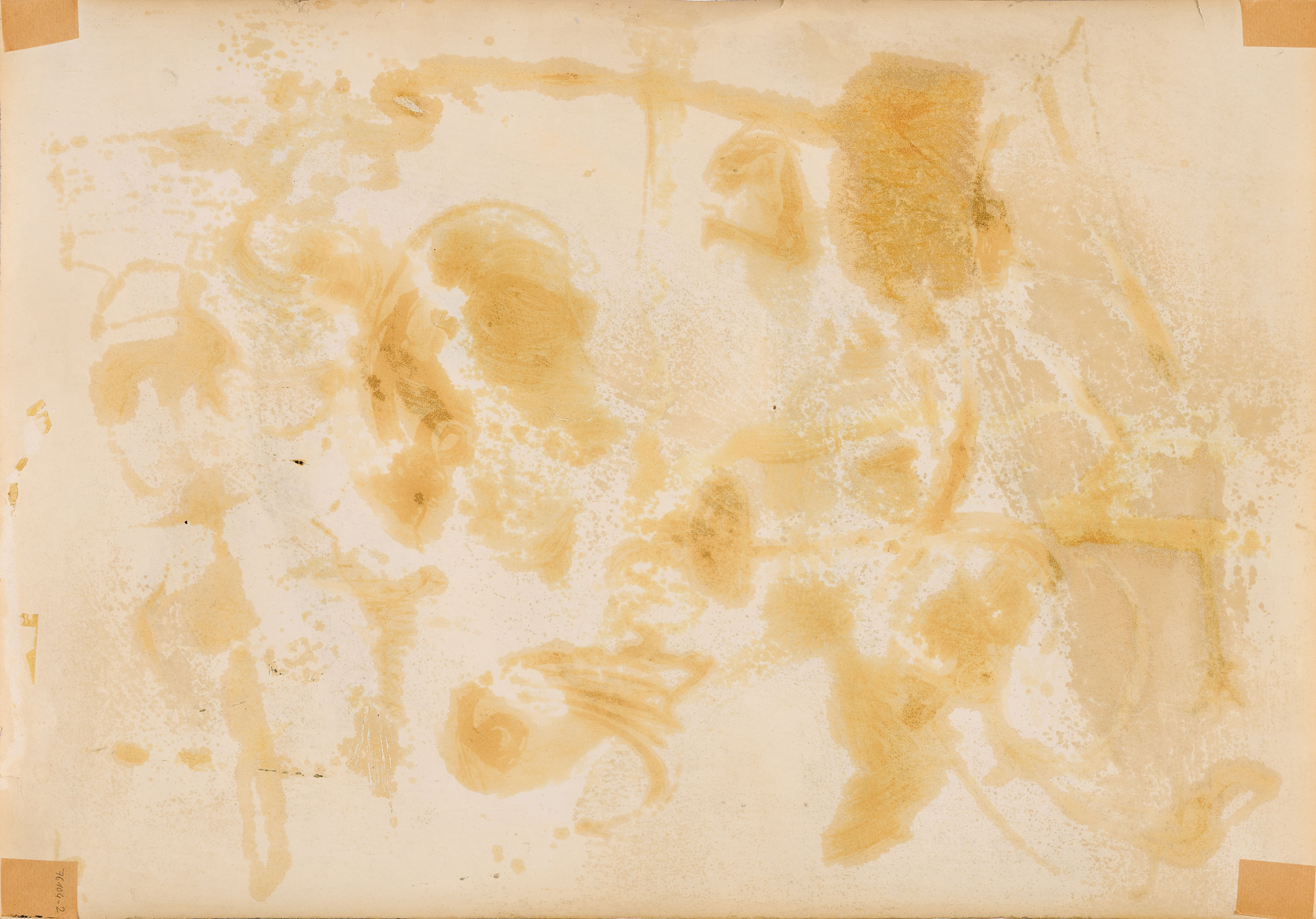 Drei kleine Einrisse (von ca. 0,5 bis ca. 1cm). Herstellungsbedingt minimal gewellt. Stecknadellöcher in den Ecken. Minimale Knickspuren an der Oberkante. Verso Durchschlagen der Farbe sowie Reste alter Montierung. Ansonsten sehr guter Zustand.