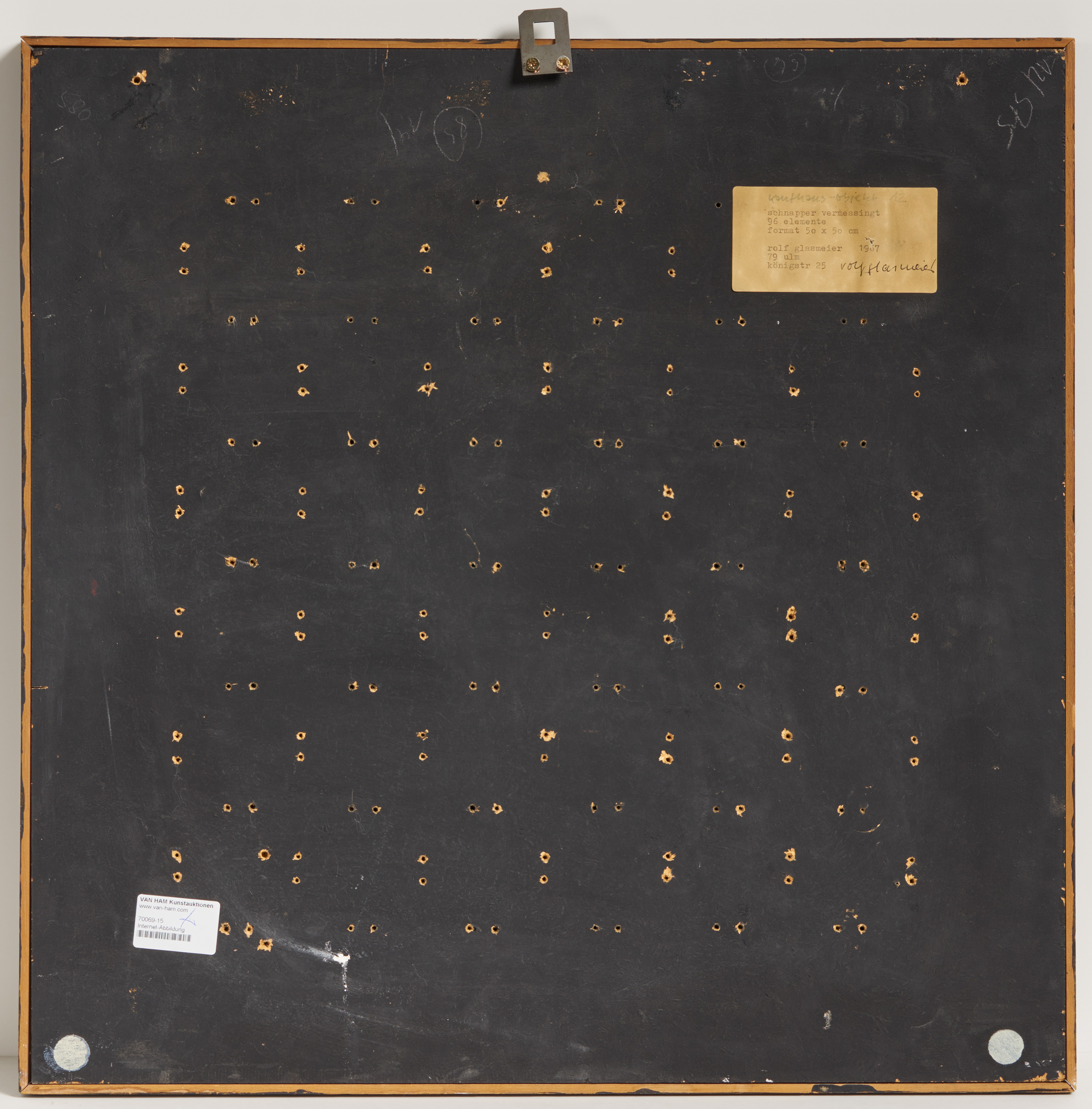 Bezeichnung: Bezeichnet und signiert verso auf Etikett: Kaufhaus-Objekt 12 rolf glasmeier. Hier zudem mit typografischen Werkangaben.