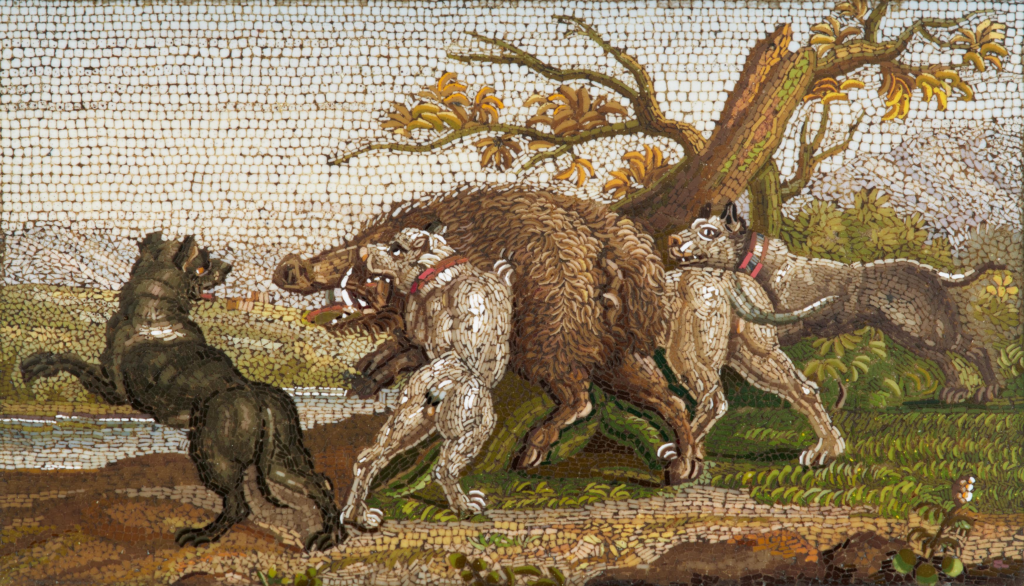 Sie zeigt einen Kampf zwischen einem Hund und einer Katze und wurde von dem römischen Mosaikkünstler Gioacchino Barberi (1783-1857) geschafften. Jedes Detail, ob die Zähne der Tiere oder die Rinde des Baumstamms, ist aus den winzigen Glassteinchen, den sog. Tesserae zusammengesetzt. Diese werden nur bei absoluter Nahsicht als einzelne Steinchen sichtbar und bilden ansonsten eine nahezu glatt wirkende an Emailmalerei erinnernde Oberfläche.
