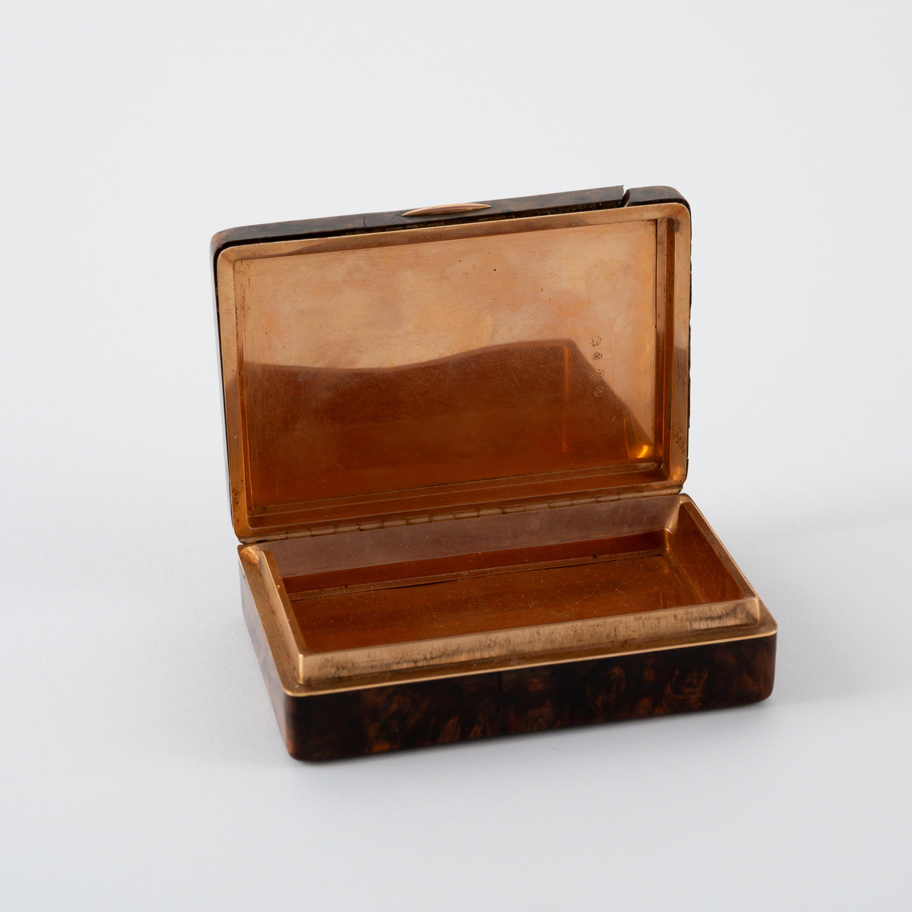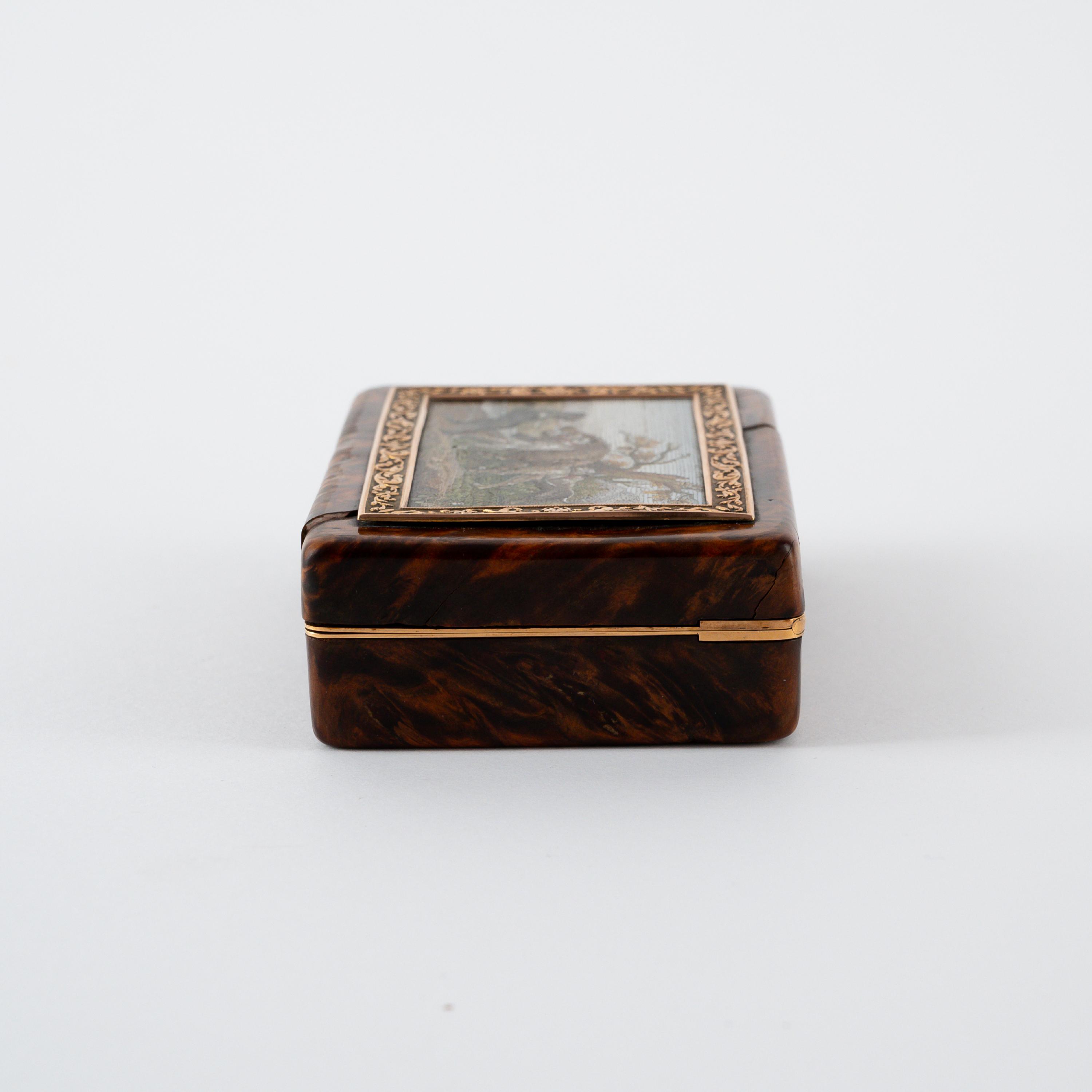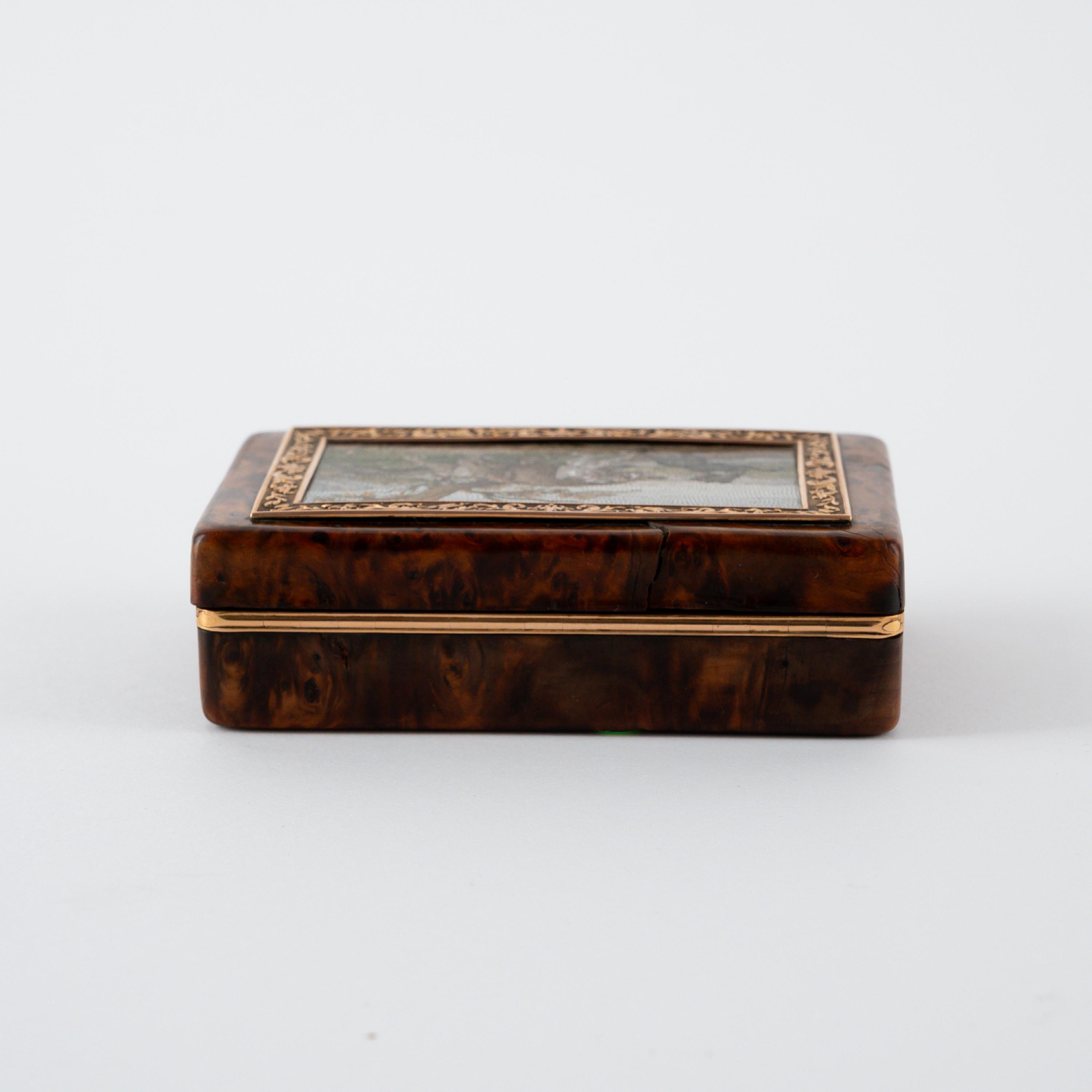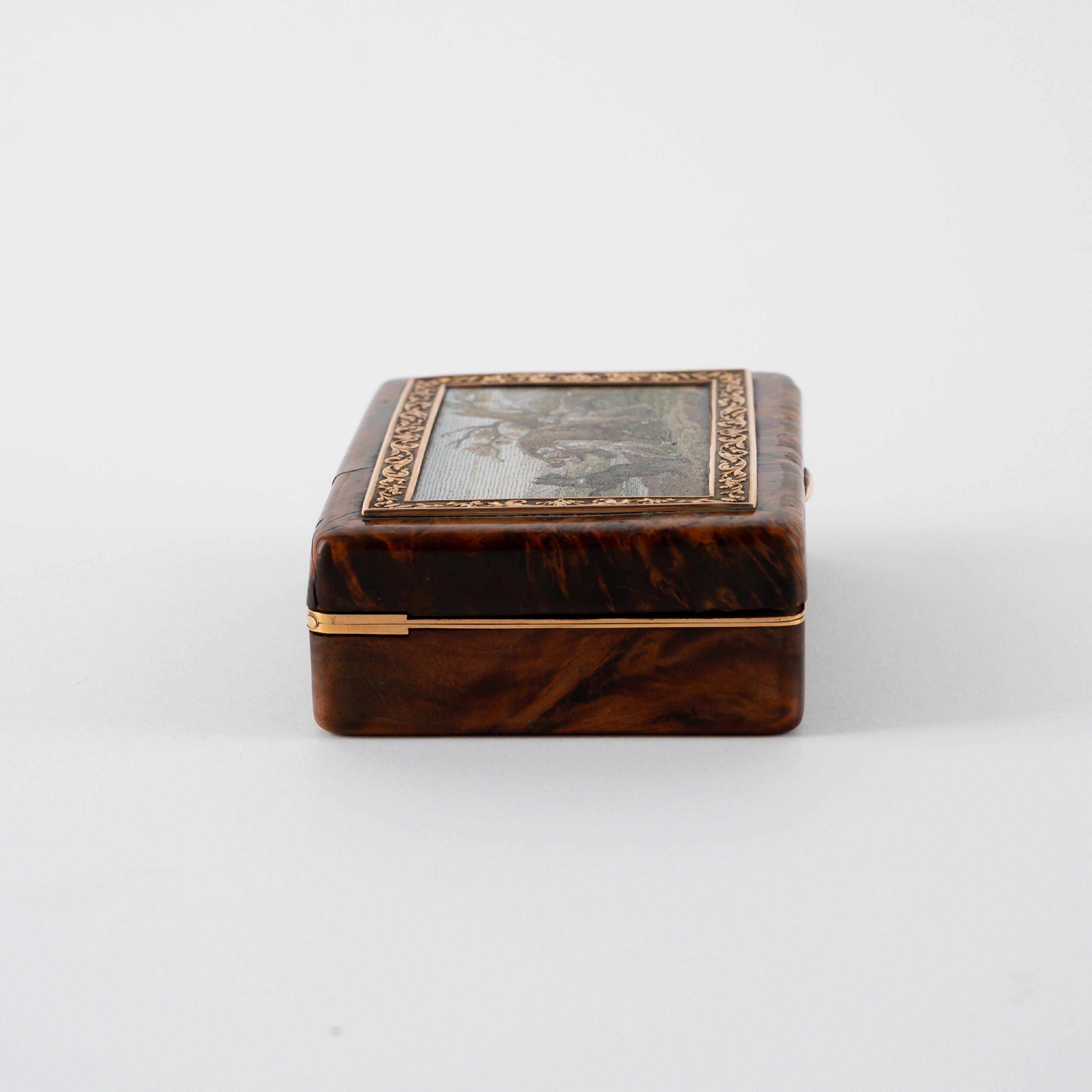 Beschreibung: Rechteckige Form. Auf der Oberseite der Tabatiere feines, rechteckiges Mikromosaik
