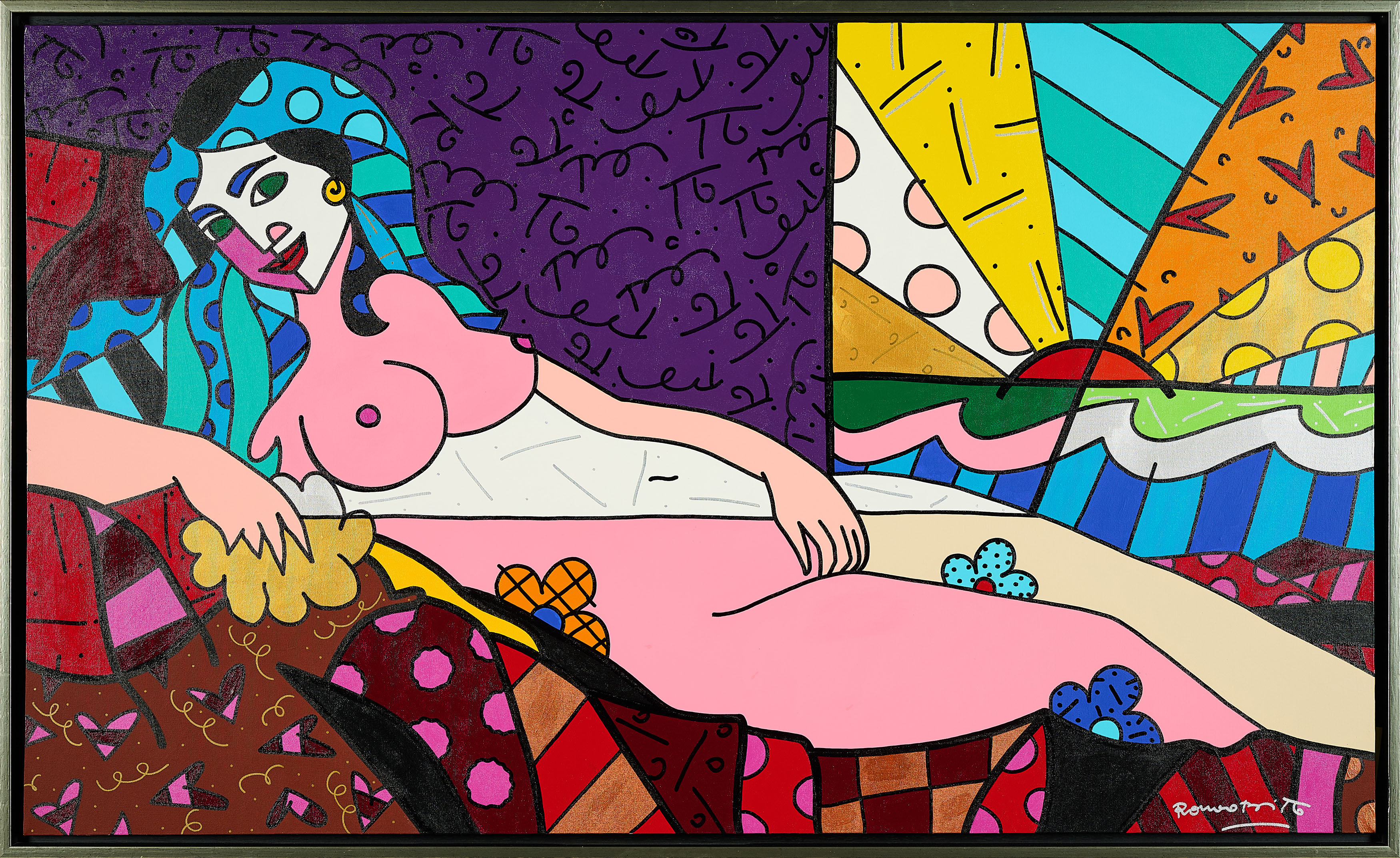Bezeichnung: Signiert unten rechts: Romero Britto. Sowie betitelt, signiert und datiert verso: A NEW DAY ROMERO BRITTO (doppelt) 2005. Sowie bezeichnet und gewidmet.