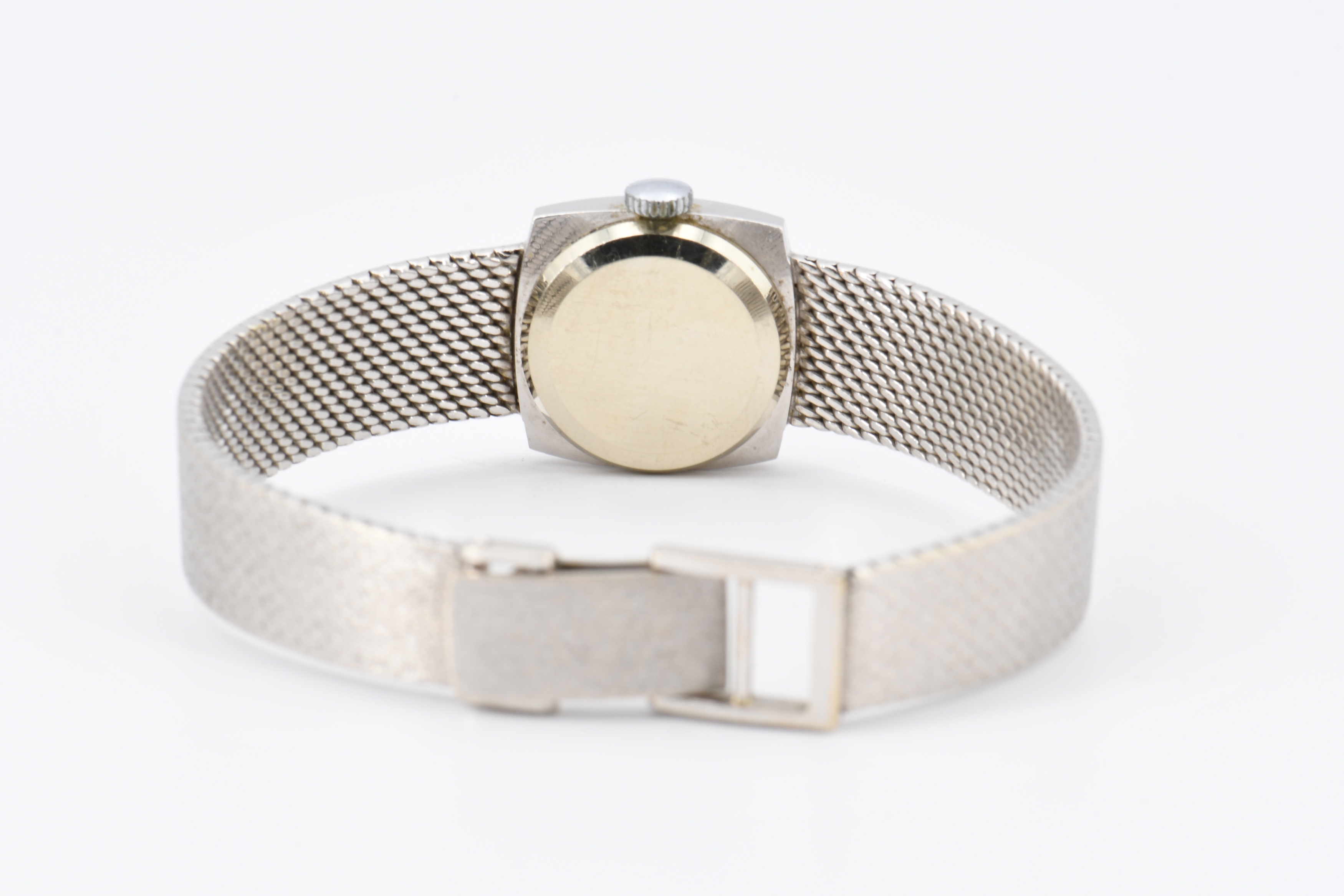 Gehäuse/Armband: 750/- Weißgold, Punze, Zffbl. silbern gebürstet, Faltschließe, Zeiger schwarz, Diamant-Lünette, 25 Brillanten zus. ca. 0,2 ct.