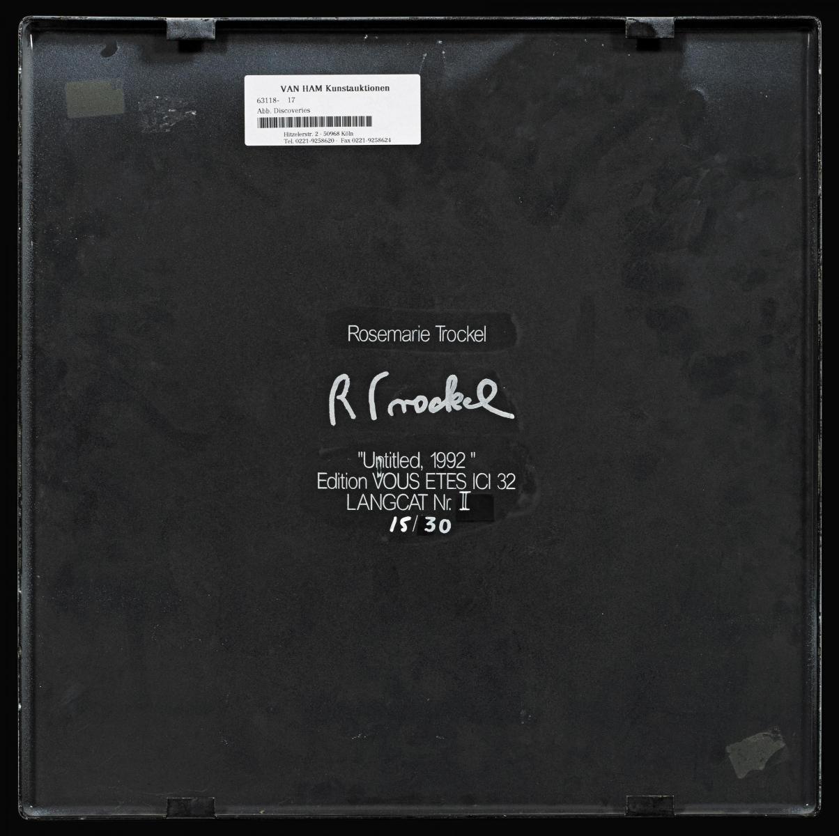 Bezeichnung: Drucksignatur verso: R Trockel. Darunter nummeriert: 15/30(eingetragen). Hier zudem die aufgedruckten Angaben: "Untitled, 1992", Edition VOUS ETES ICI 32, LANGCAT NR. II(eingetragen).