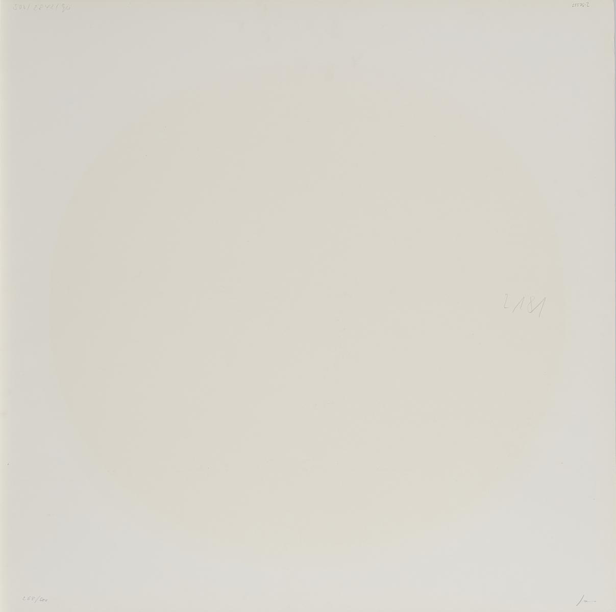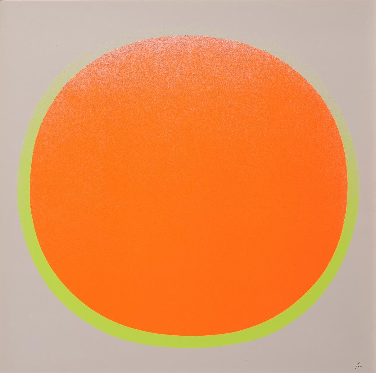 Oranger Kreis mit gelbem Kranz auf weiss. 1971. Farbserigrafie auf leichtem Karton. 51 x 54cm (60 x 60cm). Signiert sowie verso nochmals signiert und nummeriert. Edition Merian, Krefeld (Hrsg.). Ex. 268/500.