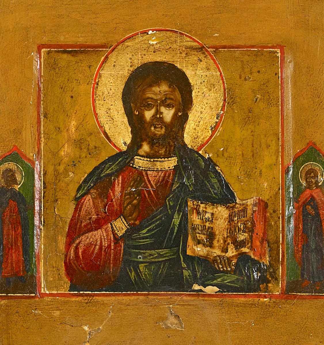 Christus Allherrscher mit zwei Heiligen am Rand. Ikone. Dazu Silber-Beschlag, Sankt Petersburg 1849, Silberschmied kyrill. AI. Eitempera auf Holz.