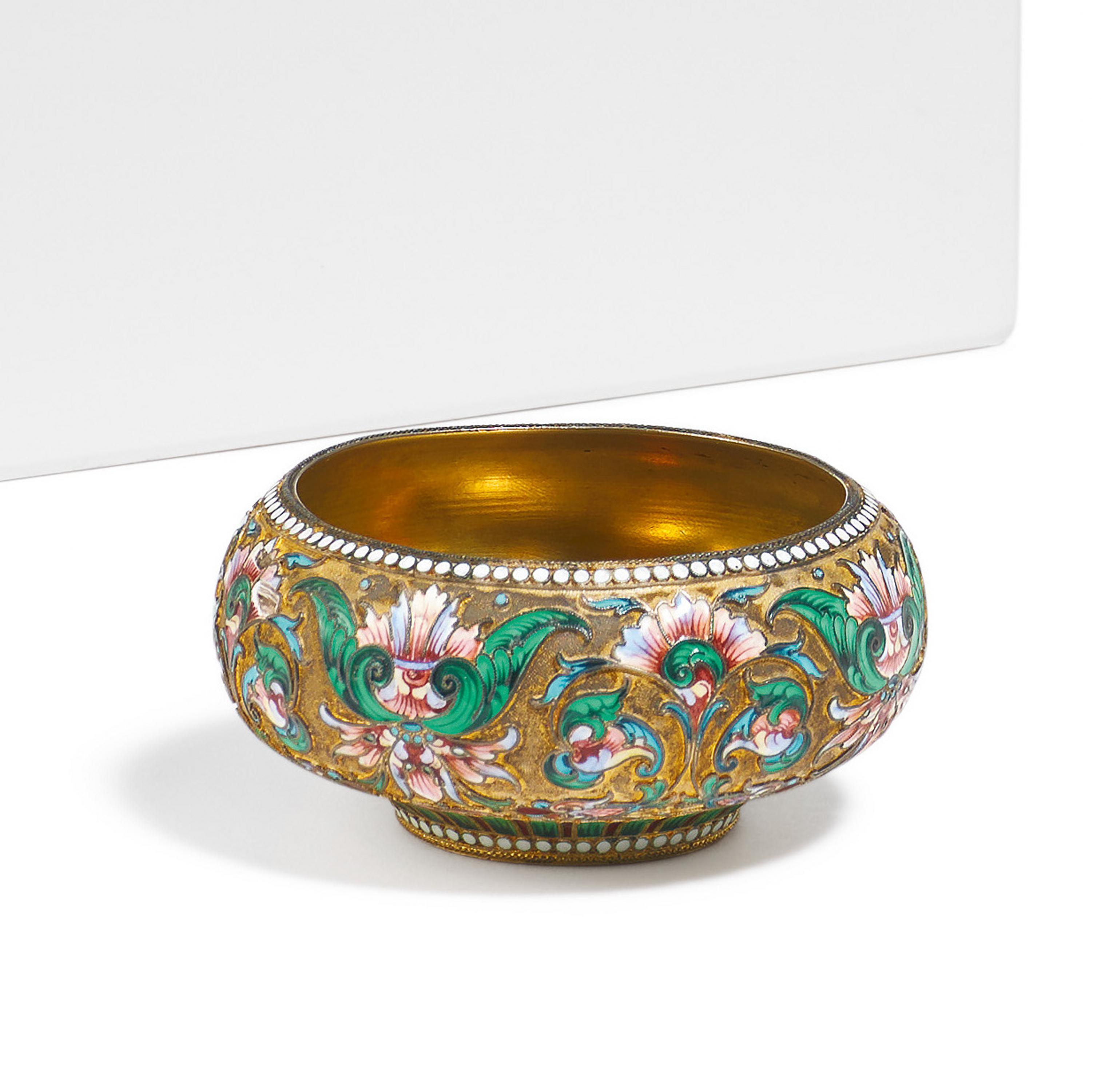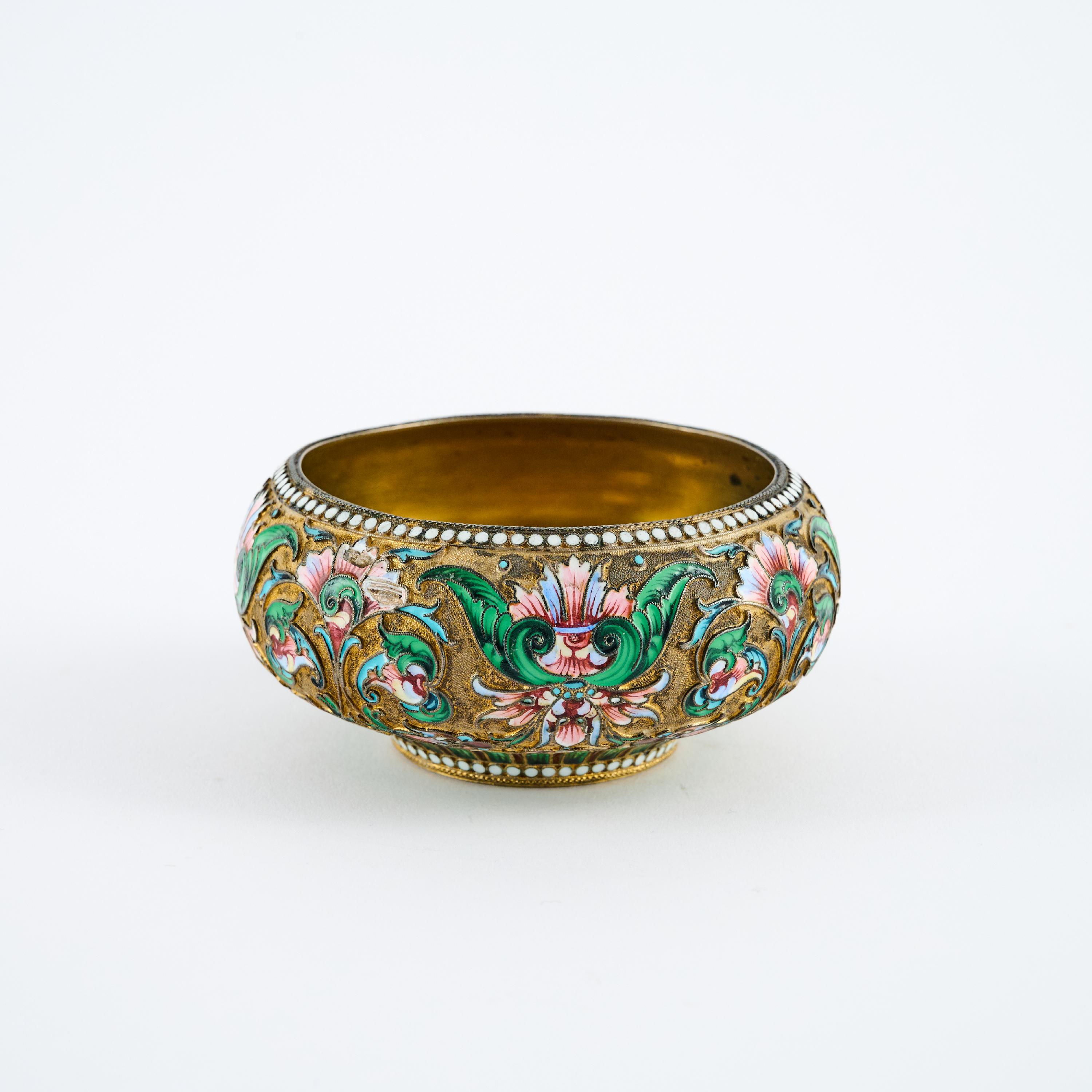 Technik: Silber, vergoldet. Farbiges Emaildekor, transluzid und opak.