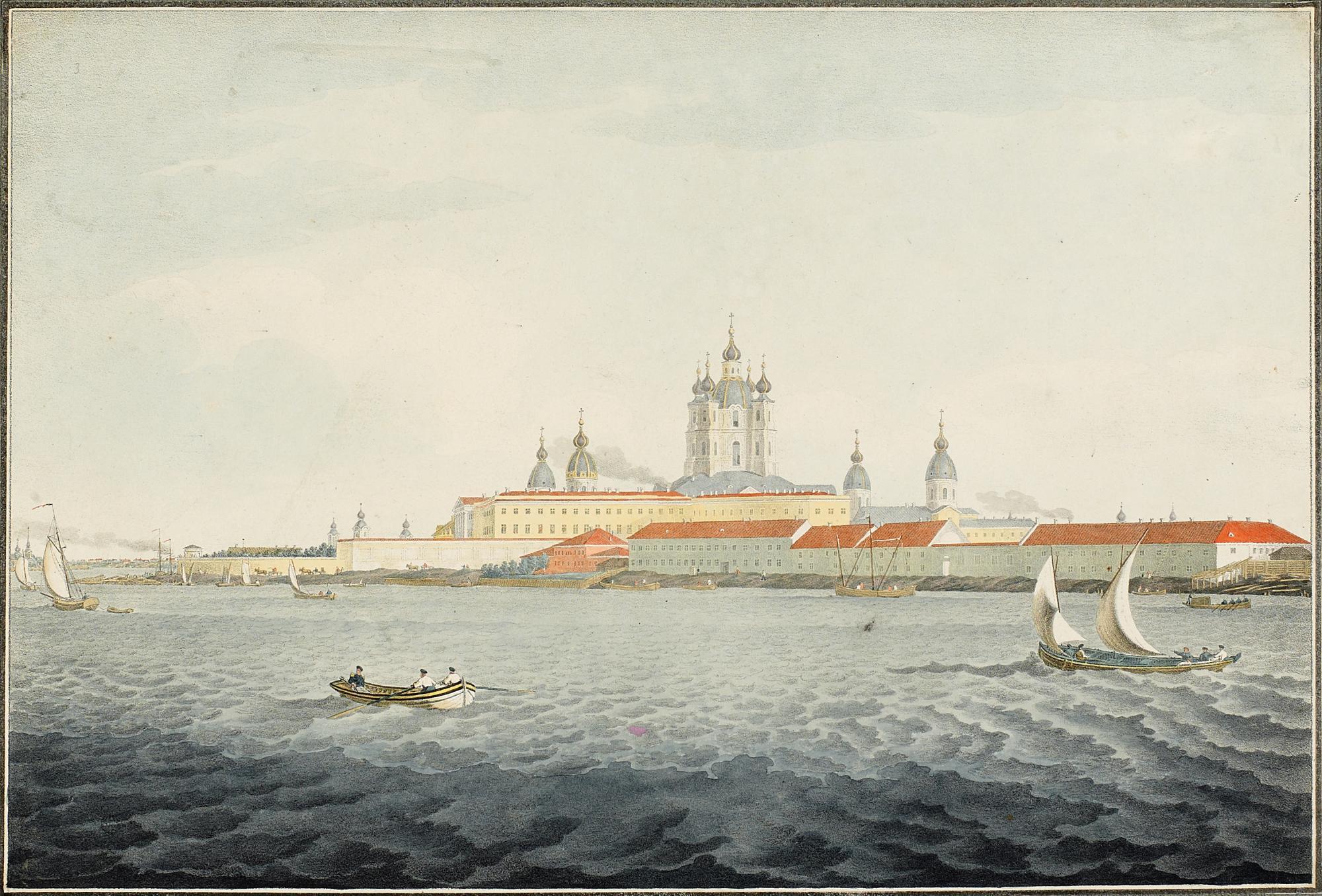 des bedeutenden, in St. Petersburg tätigen, Architekten Bartolomeo Rastrelli. Rückseitig: Couvent de Smolny. Kolorierter Druck auf Papier. 29,5 x 43,5cm.
