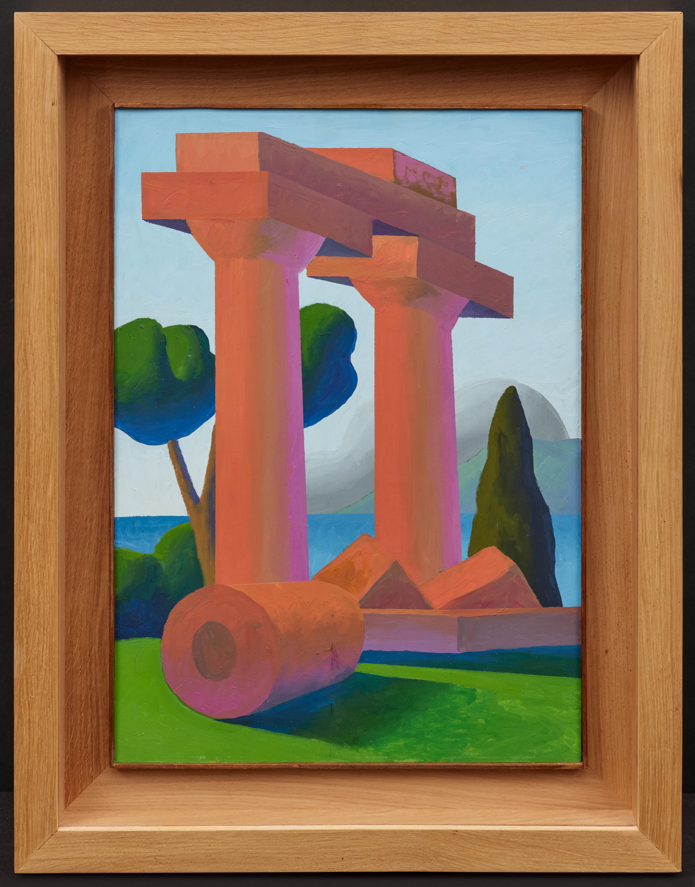 Das Gemälde zeigt mittig zwei aufrechte Säulen, die einer antiken Ruine zu entstammen scheinen. Weitere Säulenelemente liegen davor auf dem sattgrünen Rasen. Diese Überreste einer Hochkultur befinden sich innerhalb einer menschenleeren, idyllischen Landschaft mit Pinien und Zypressen vor einem Gewässer und Berg. In einem auf das Wesentliche reduzierten, naiven Stil, ähnlich wie Andreas Schulze, präsentiert uns Salvo sein Sujet. Erinnerungen an reale Orte werden wach, doch das Kolorit - das seinesgleichen sucht - taucht die Szenerie in eine surreale Traumwelt. Die Säulen schimmern Orangebraun mit pinkvioletten Schatten - kontrastiert von Blau, Grün, Grau. Eine besondere Lichtstimmung verklärt die Szene und nährt die Sehnsucht nach mediterraner Landschaft. Kultur und Natur verbinden sich, Realität und Traum, Vergangenheit und Präsens werden eins. Das Verstreichen der Zeit wird uns Betrachtenden ebenso bewusst wie die Unendlichkeit eines Moments, die Salvo hier eingefangen hat.