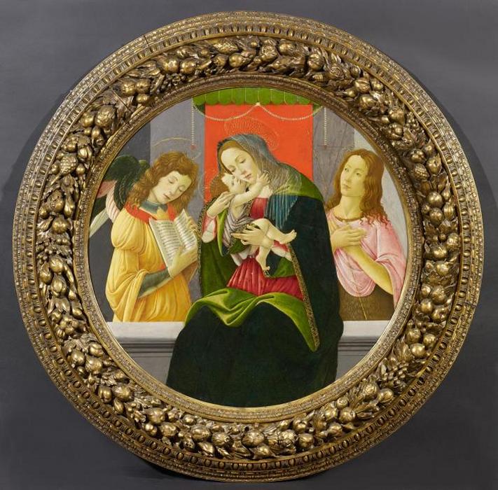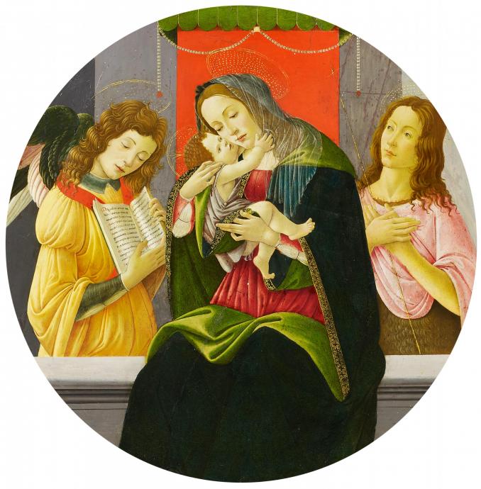 Madonna mit dem Kind, Johannes dem Täufer und einem Engel. Tempera/Öl auf Pappel. Parkettiert. Im Durchmesser ca. 87,5cm x Geschnitzter und vergoldeter Rahmen (19.Jh.).