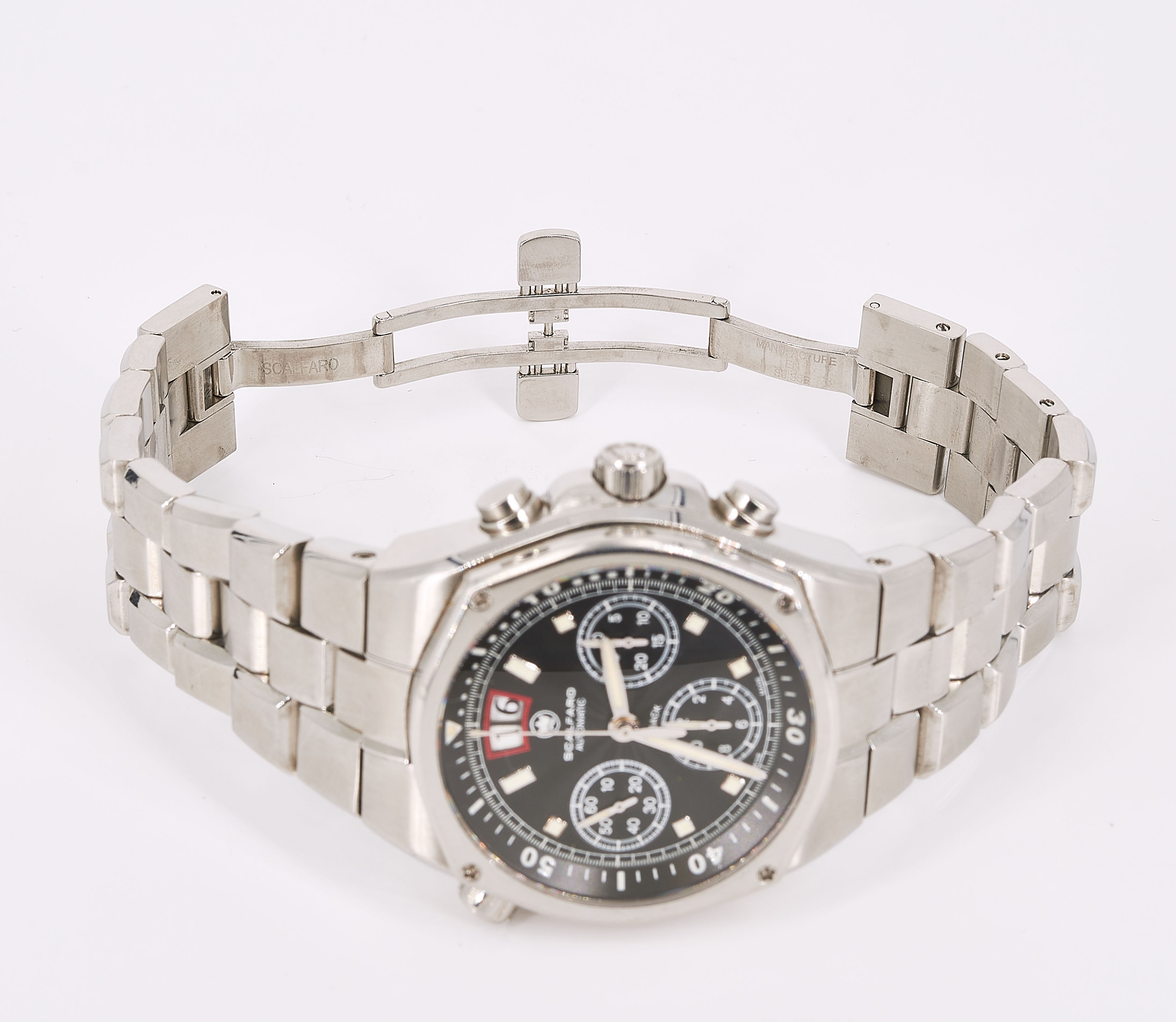 Beschreibung: Scalfaro Chronograph mit 30-Minutenanzeige bei "3" Uhr, 12-Stundenanzeige bei "6" Uhr,