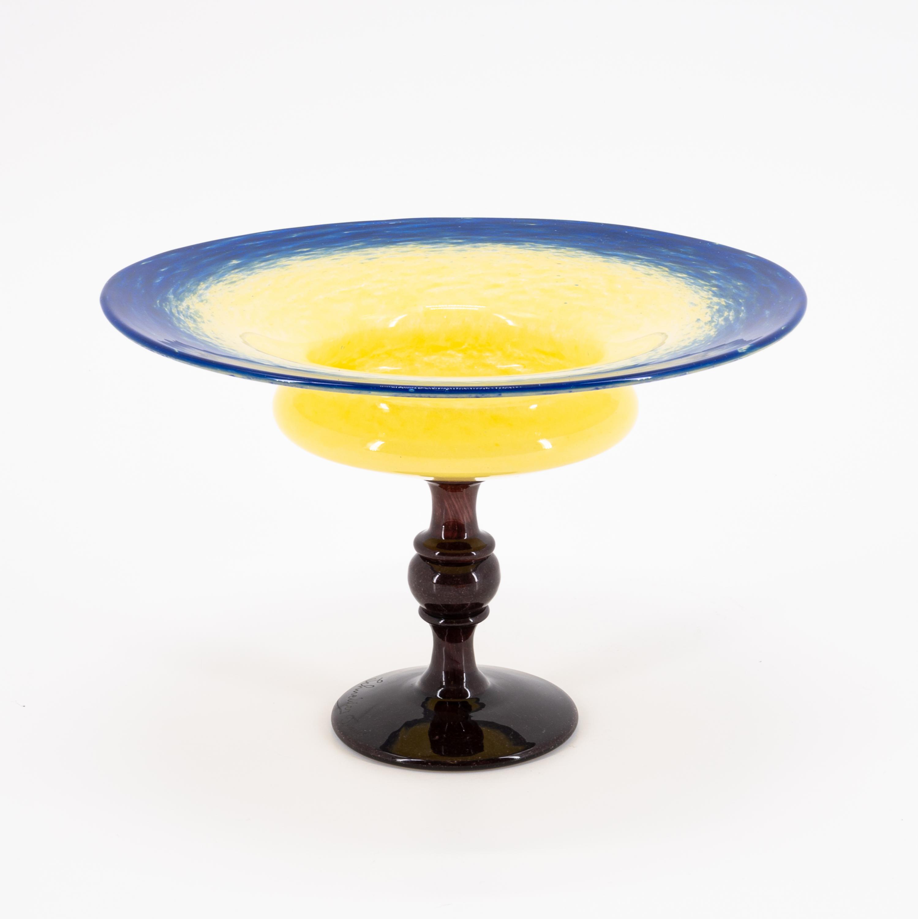 Material: Farbloses Glas, mit gelben, blauen und im Standfuß violetten Pulvereinschmelzungen.