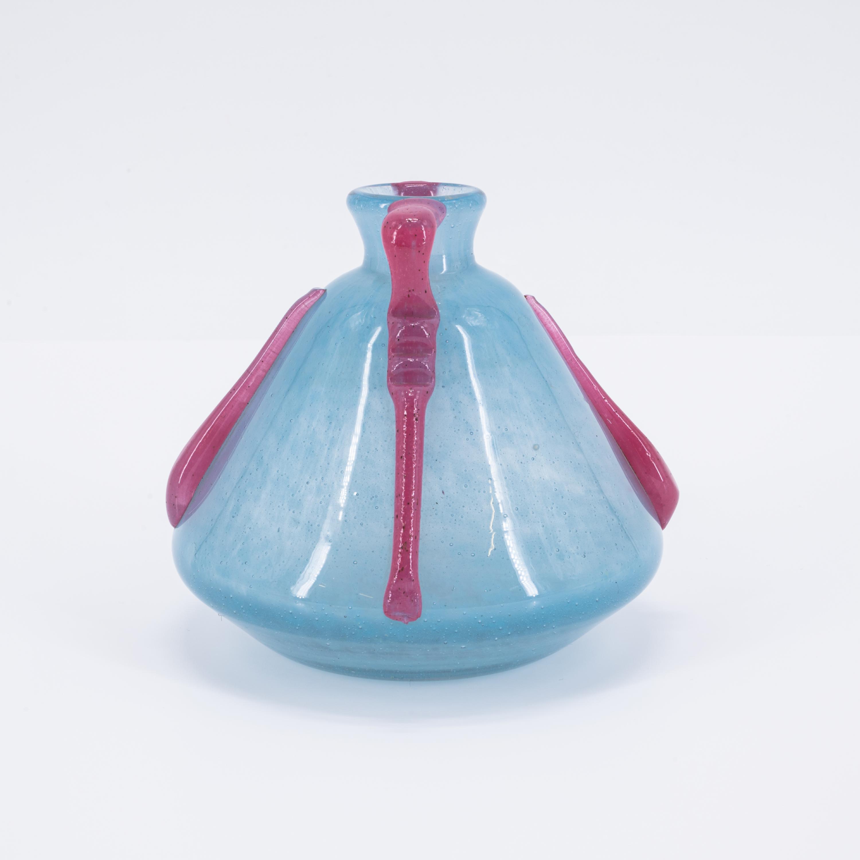Material: Farbloses Glas mit hellblauen Pulvereinschmelzungen. Heiß applizierte Glasgriffe mit rosa Pulvereinschmelzungen.