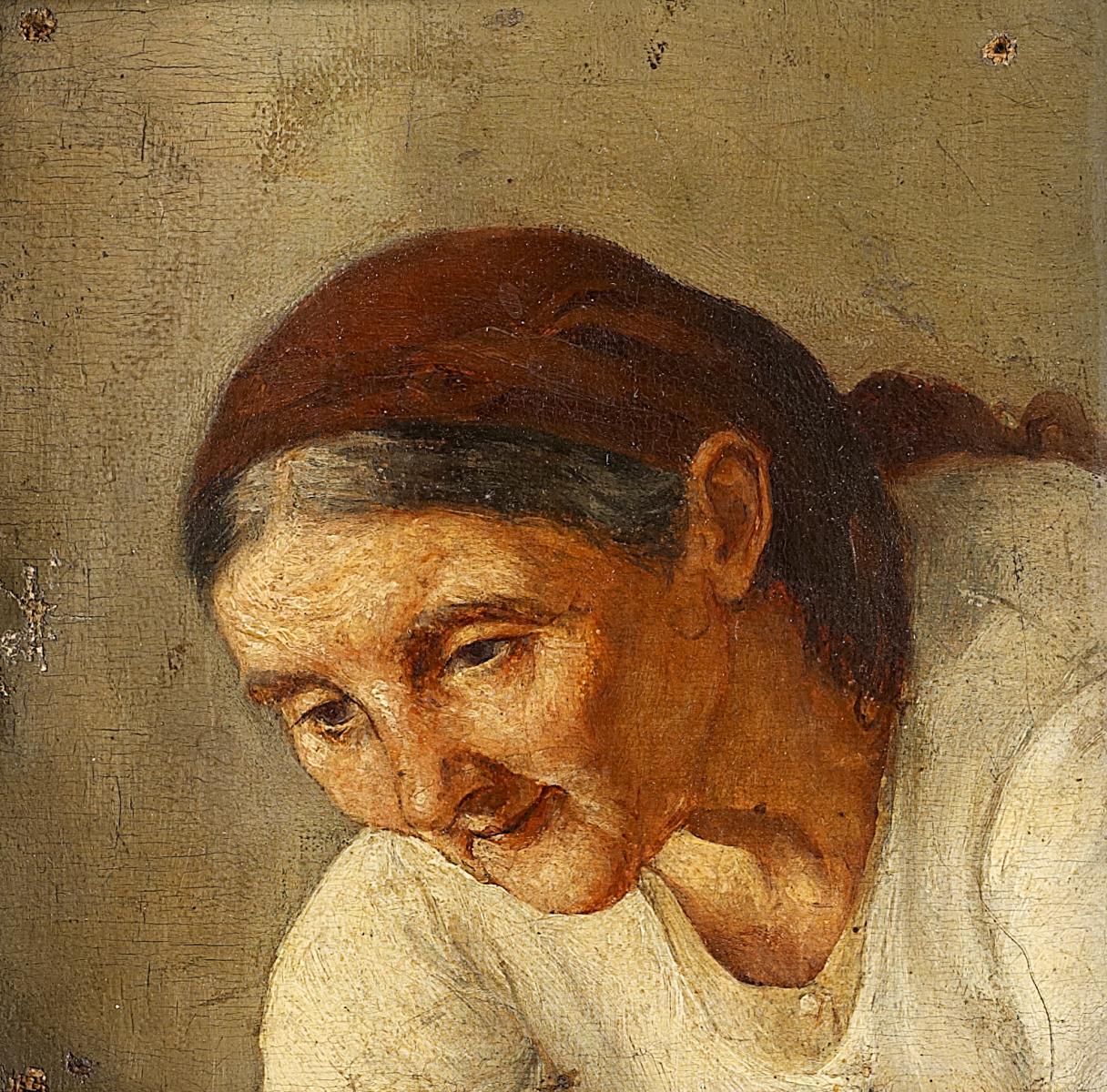 Bildnis einer Bäuerin. Öl auf Leinwand. Auf Holz gezogen. 11,5 x 11,5cm. Rahmen.