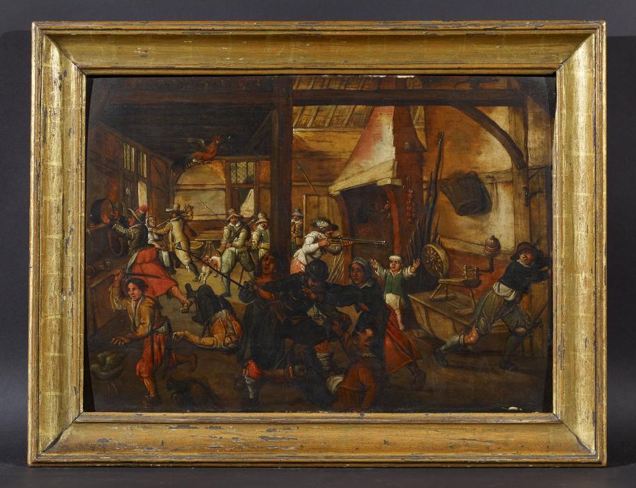 Der Überfall im Bauernhaus. Öl auf Holz. 33,5 x 46,5cm. Rahmen.