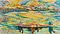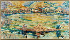 Die südkoreanische Künstlerin und Meisterschülerin von Georg Baselitz, Seo Su-gyeong, besser bekannt unter ihrem Künstlernamen SEO, erzeugt mit ihren übermalten Collagen aus teils Millionen von Papierschnipseln immersive Bildwelten. Die uns vorliegende Arbeit ist der 2004 von SEO begonnenen Serie Reisfeld zuzuordnen. In dieser Serie arbeitet die Künstlerin einen Gegenentwurf zur von Hektik geprägten Gesellschaft aus. Der Betrachter verlässt beim Eintauchen in die Reisfelder seine gewohnte Sphäre und setzt sich einem neuen, entschleunigten Rhythmus aus. Der monumentale Charakter der Arbeit umfängt den Betrachter und konfrontiert ihn so mit der Allmacht der Natur. Die Menschen auf ihrem Boot mit der Reisernte wirken winzig und verloren in dem Idyll der Abendsonne. Die Natur ist hier aber nicht als Gegenspieler oder Feind des Menschen dargestellt, sondern vielmehr als ein Partner und Freund.