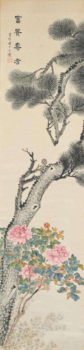 Zustand A/B. Beilage: Bild des Reichtums und des Langen Lebens. Rosen unter Kiefern. Tusche und Farben auf Papier. Hängerolle, 253x60,5cm. Aufschrift und Siegel.