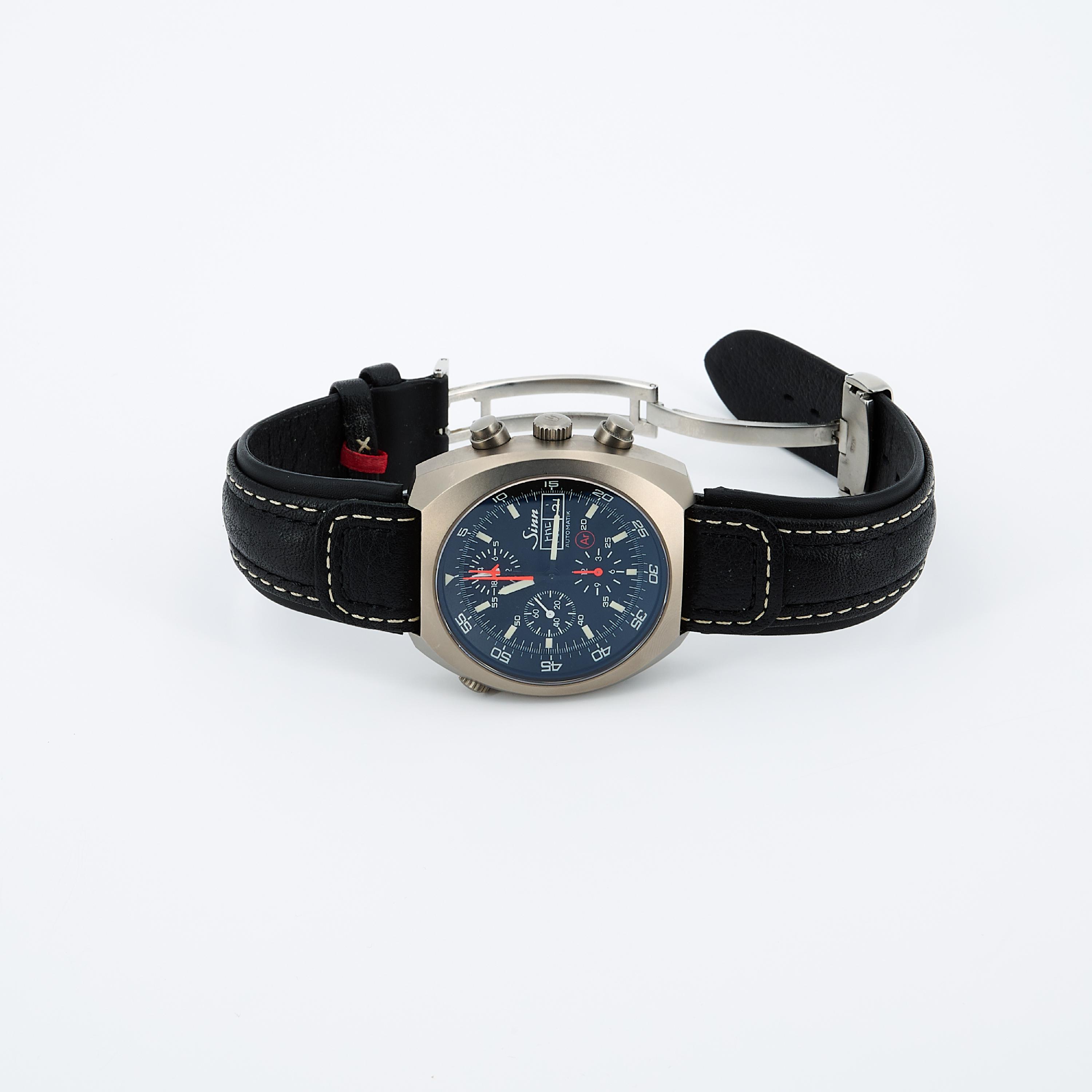 Gehäuse/Armband: Titan, Lederarmband mit Faltschließe, Zffbl. schwarz, Zeiger weiß, Indizes weiß, Leuchtmasse.