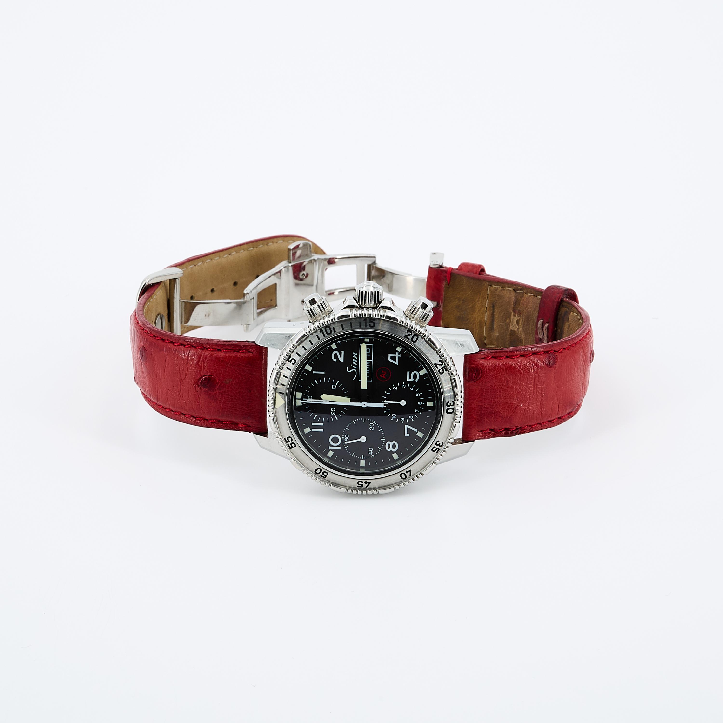 Gehäuse/Armband: Stahl, Lederarmband mit Doppelfaltschließe, Zffbl. schwarz, Zeiger weiß, arabische Ziffern weiß, Leuchtmasse.
