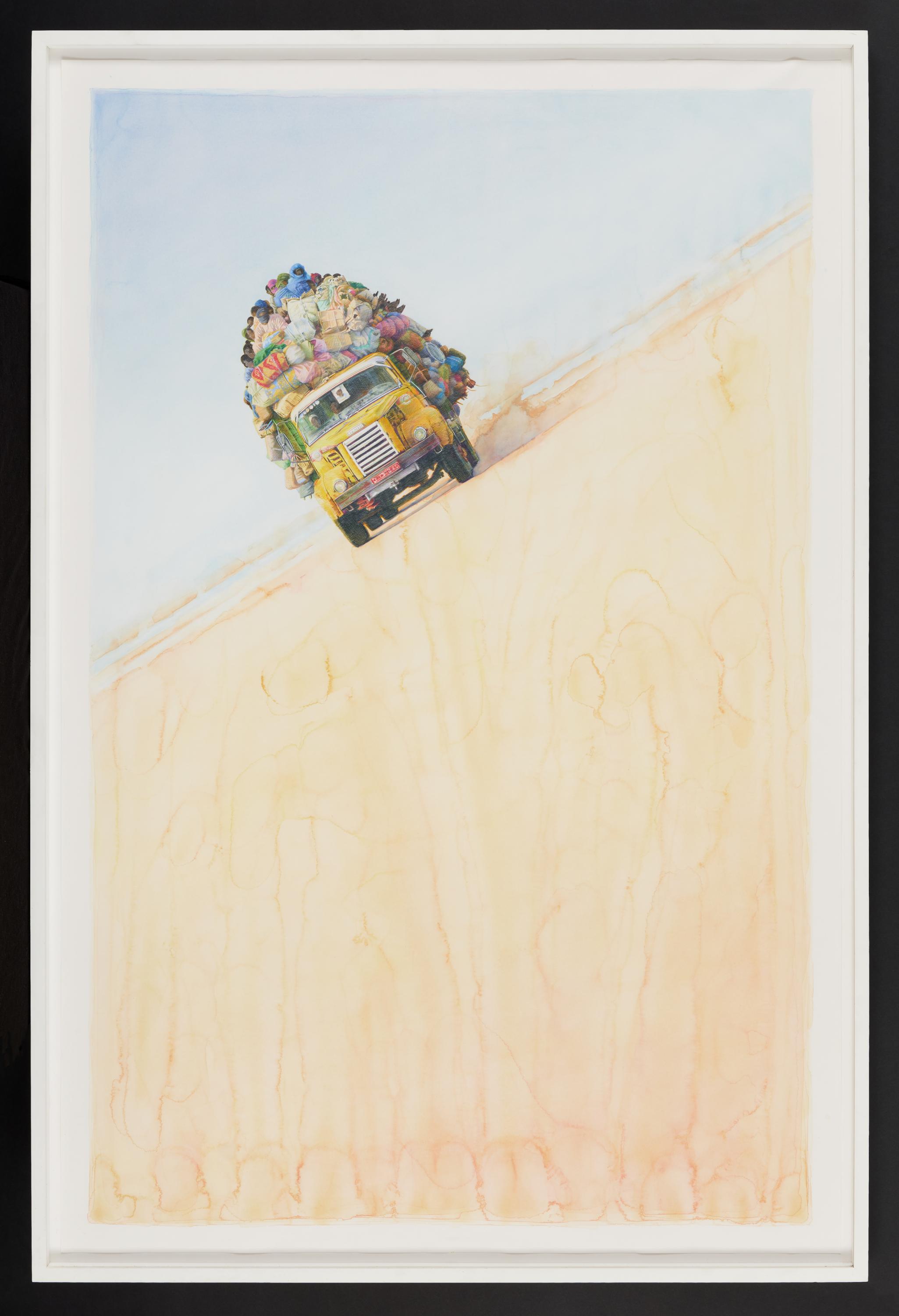 S?awomir Elsners "Odyssee 1" eröffnet dem Betrachter eine faszinierende Bildwelt, die sowohl durch technische Virtuosität als auch durch inhaltliche Tiefe besticht. Die Papierarbeit zeigt ein überladenes Fahrzeug, das eine steile Dünenlandschaft hinabfährt. Diese Szene vermittelt eine subtile Spannung: Einerseits die Fragilität und Instabilität der Situation, andererseits die Entschlossenheit der Passagiere, die symbolisch für menschliche Überlebensinstinkte und die Suche nach einem besseren Ort stehen könnten.