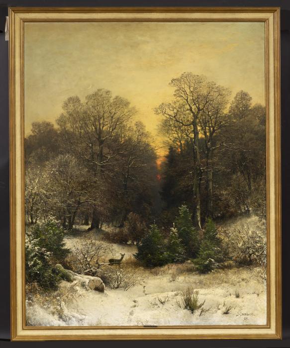 Abenddämmerung über dem Winterwald. Signiert und datiert unten rechts: S. Jacobsen 89. Öl auf Leinwand. 150,5 x 121cm. Rahmen.