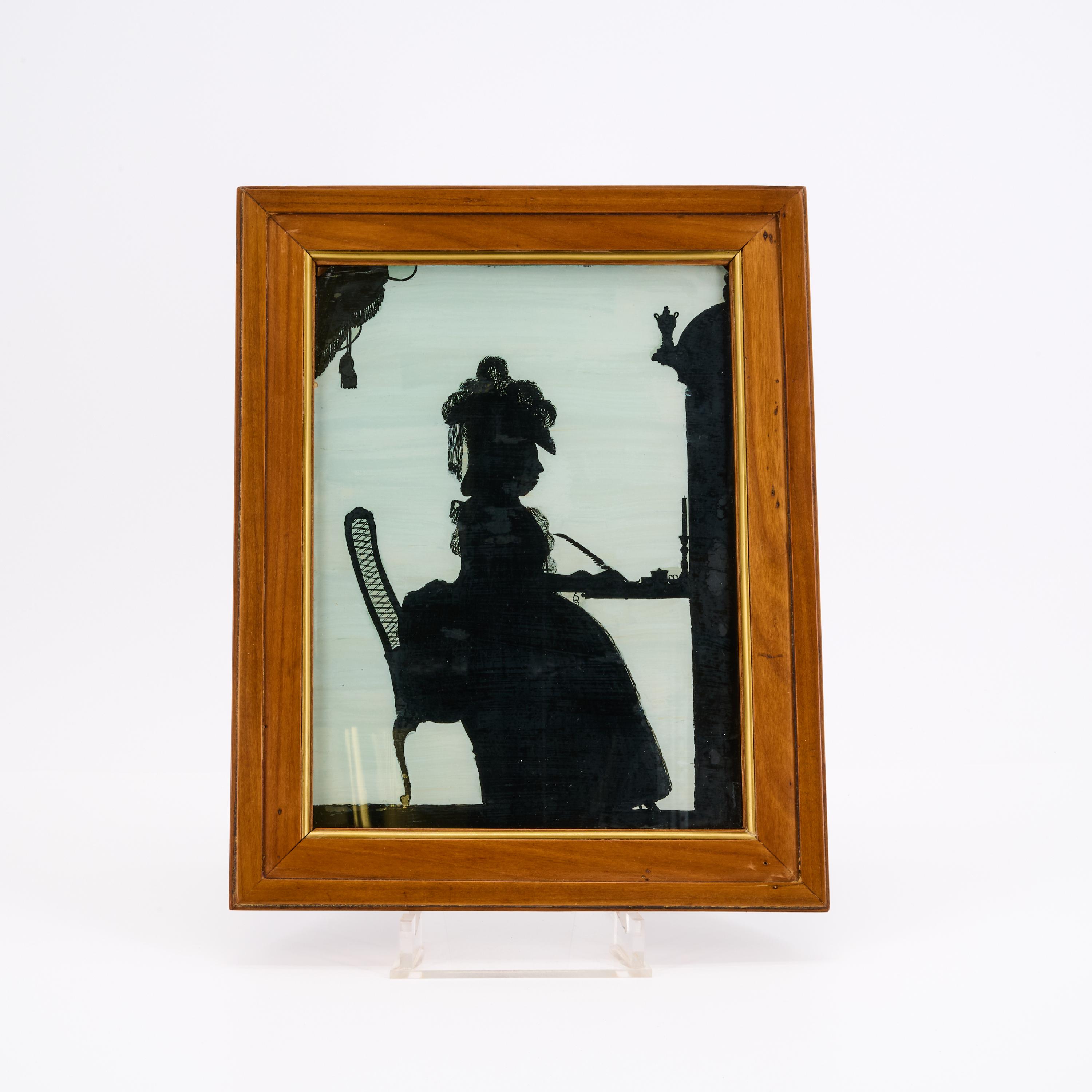 HINTERGLASBILD MIT DAME AM SCHREIBTISCH & HINTERGLASBILD MIT KLEINEM KIND IN BUCH LESEND ALS SILHOUETTENDARSTELLUNGEN.