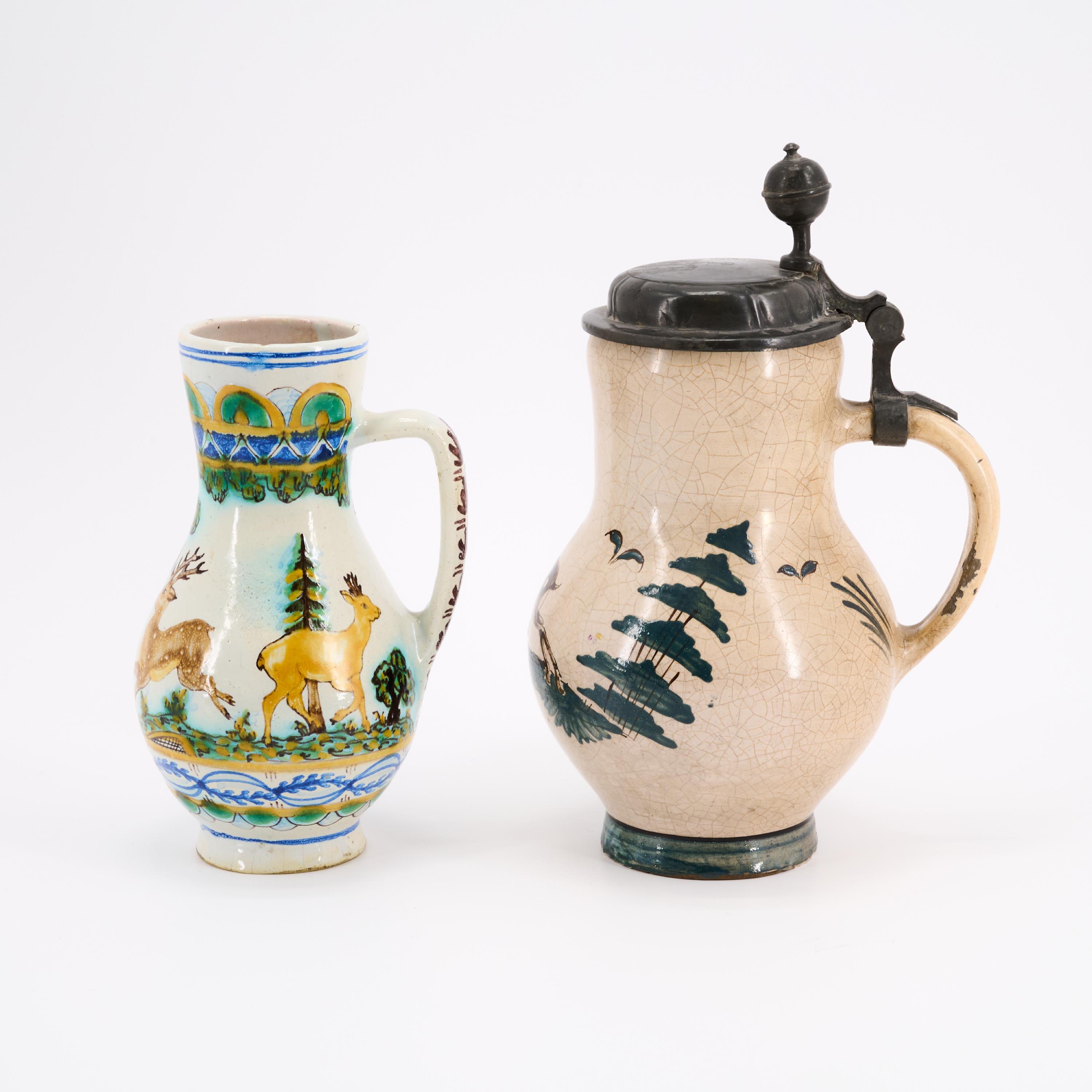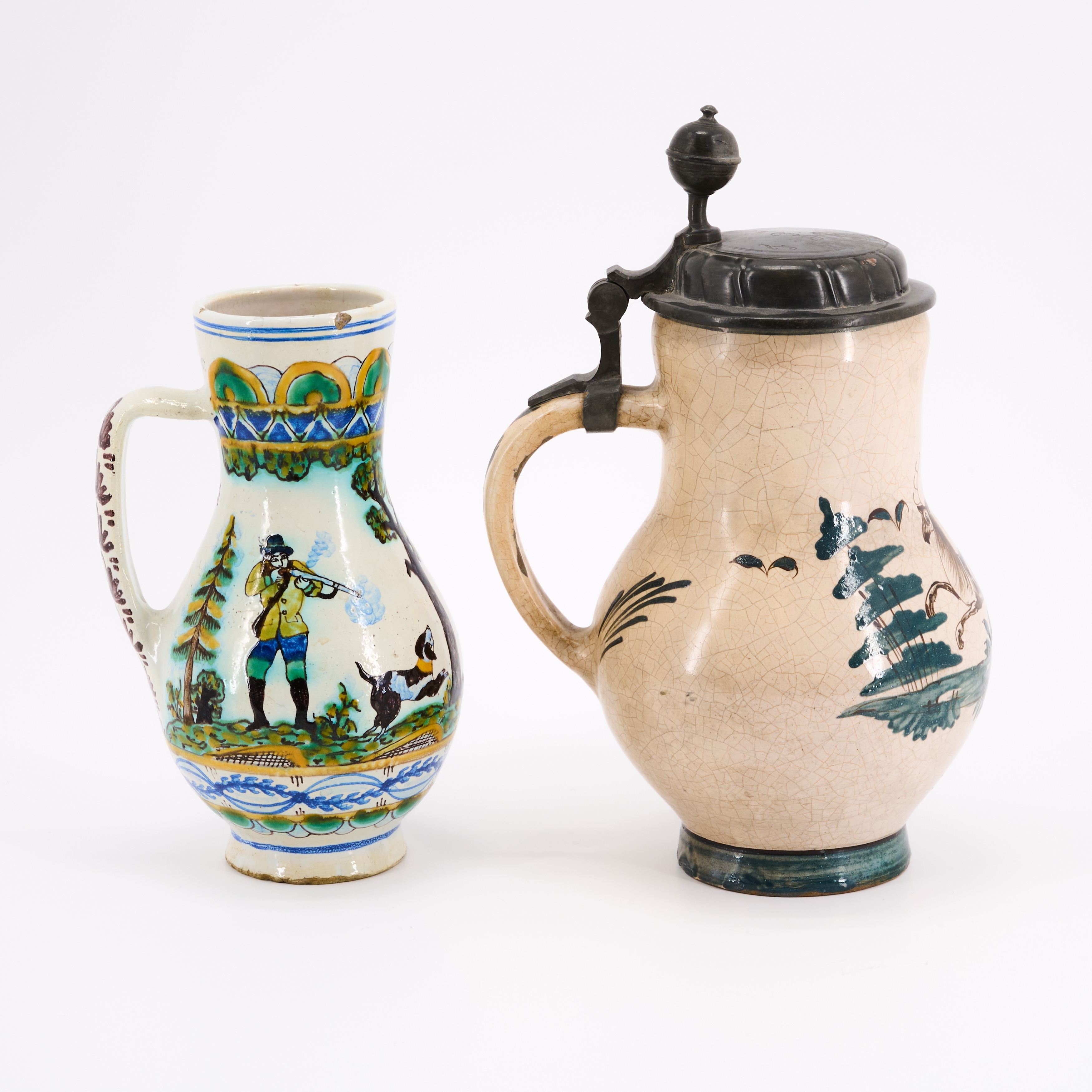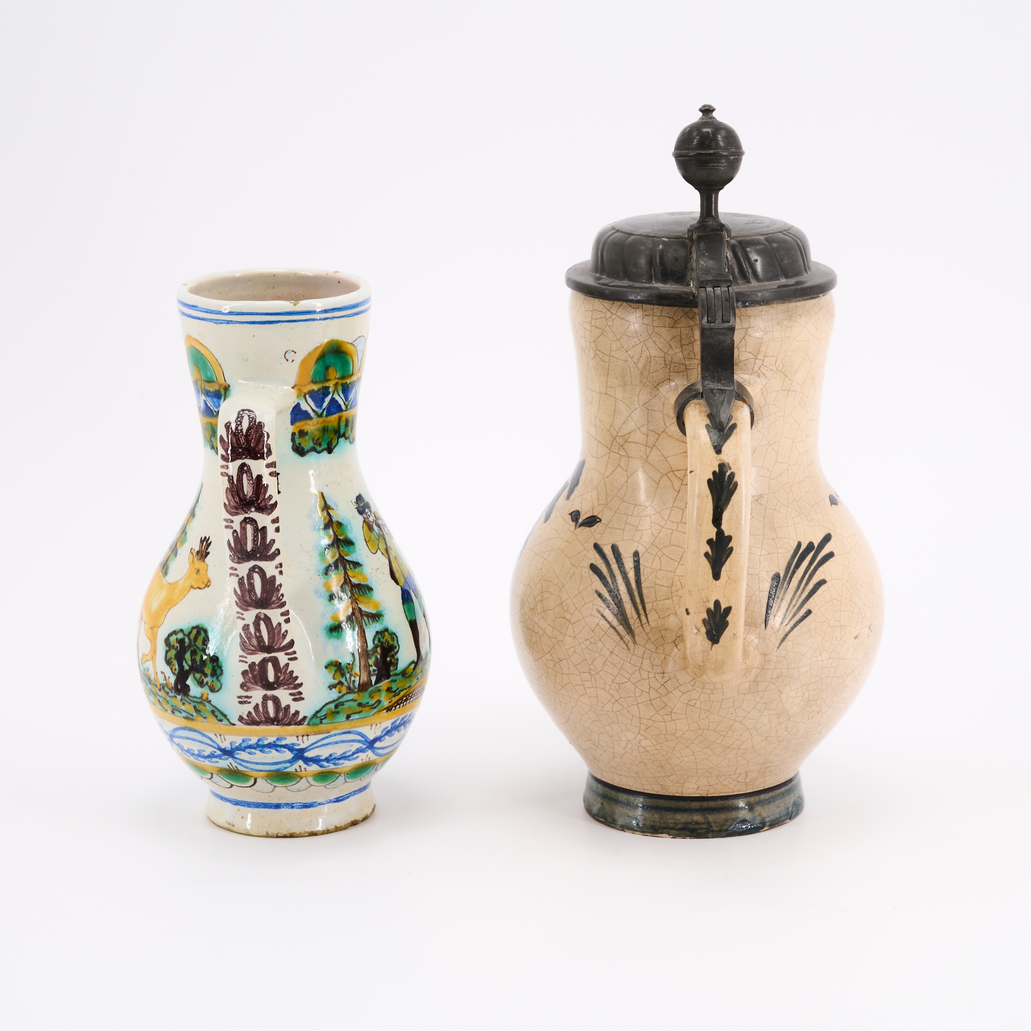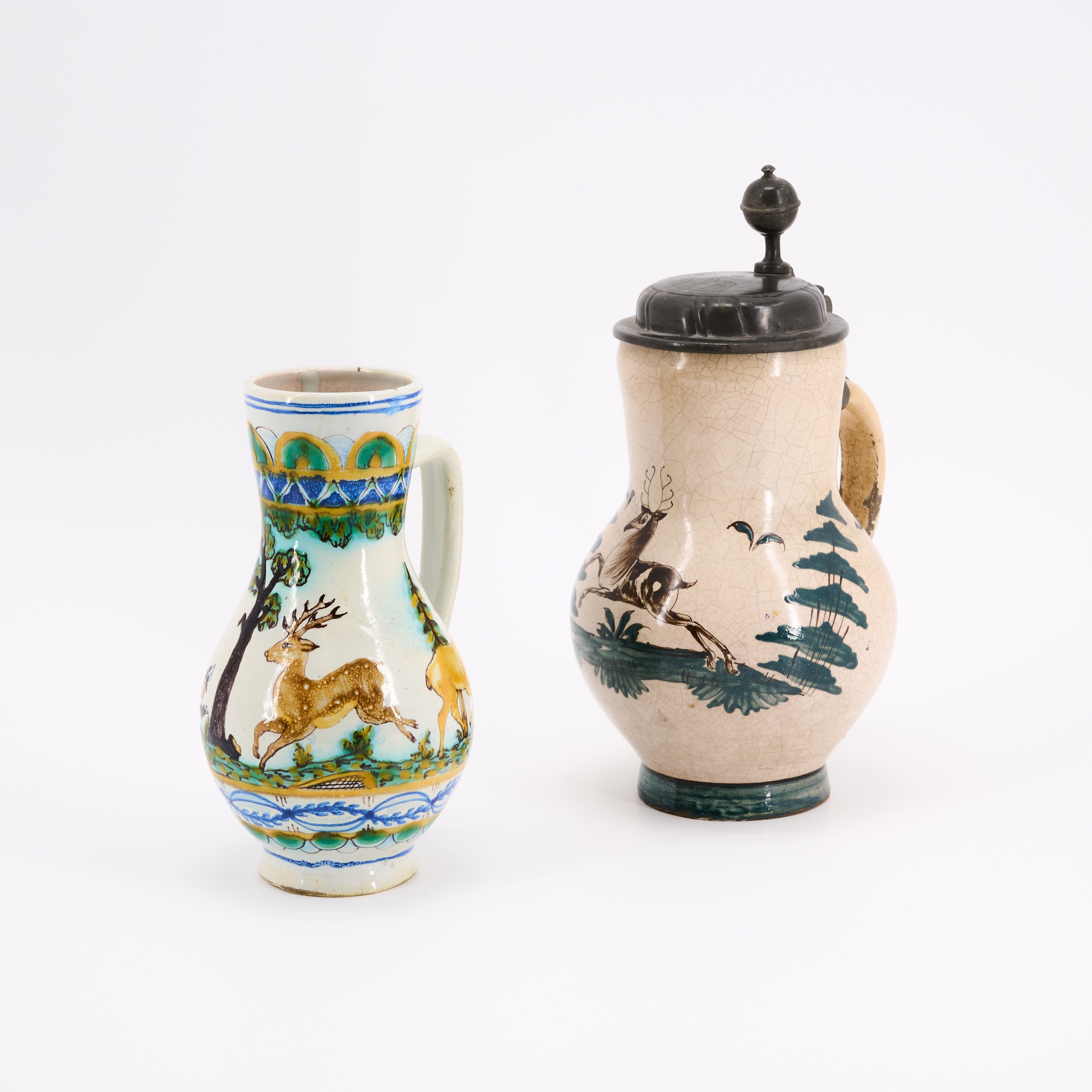 Beilage: Birnkrug mit springendem Hirsch Höhe 28,5 Keramik, scharnierter Zinndeckel .