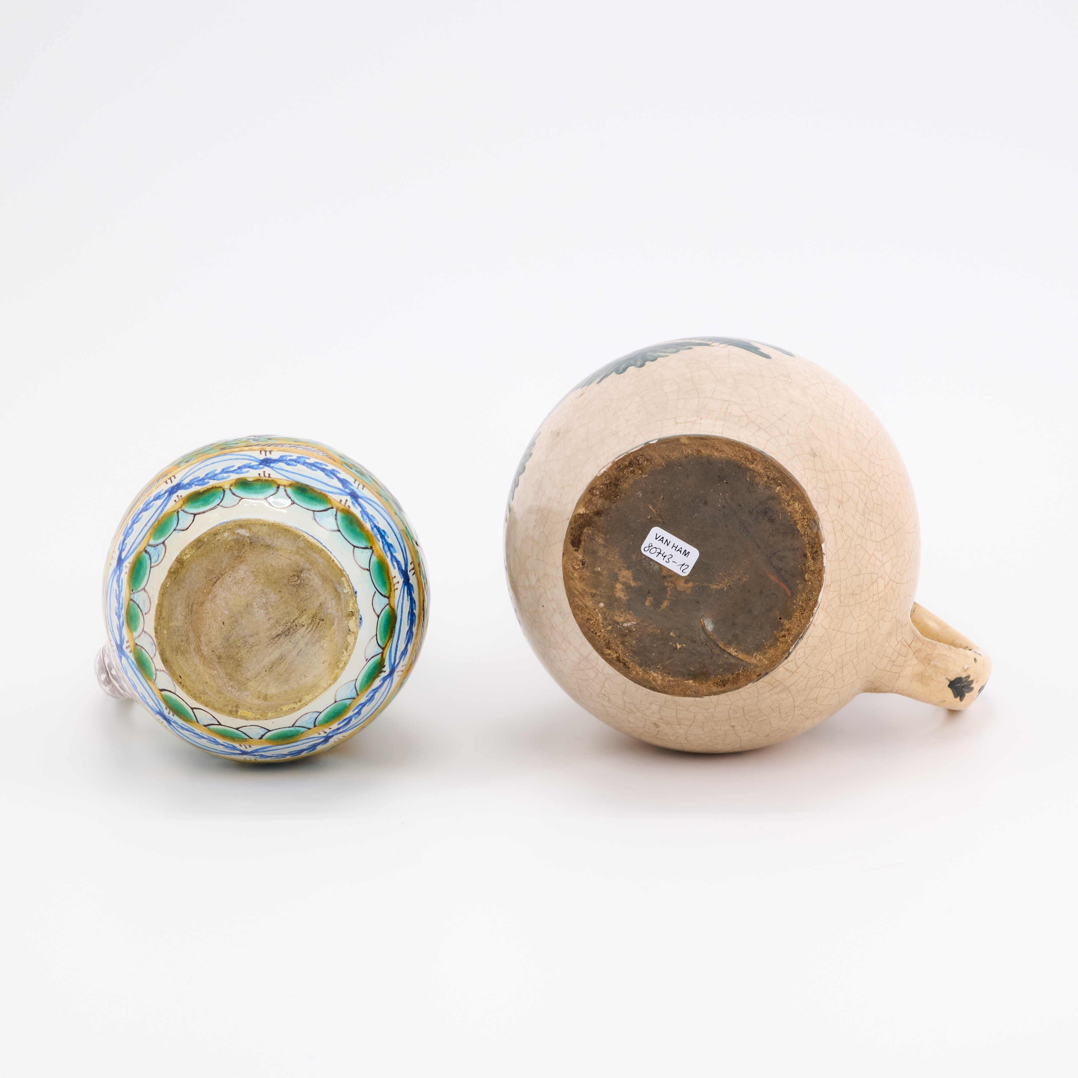 Technik: Heller Scherben mit weißer Glasur und polychromem Dekor .